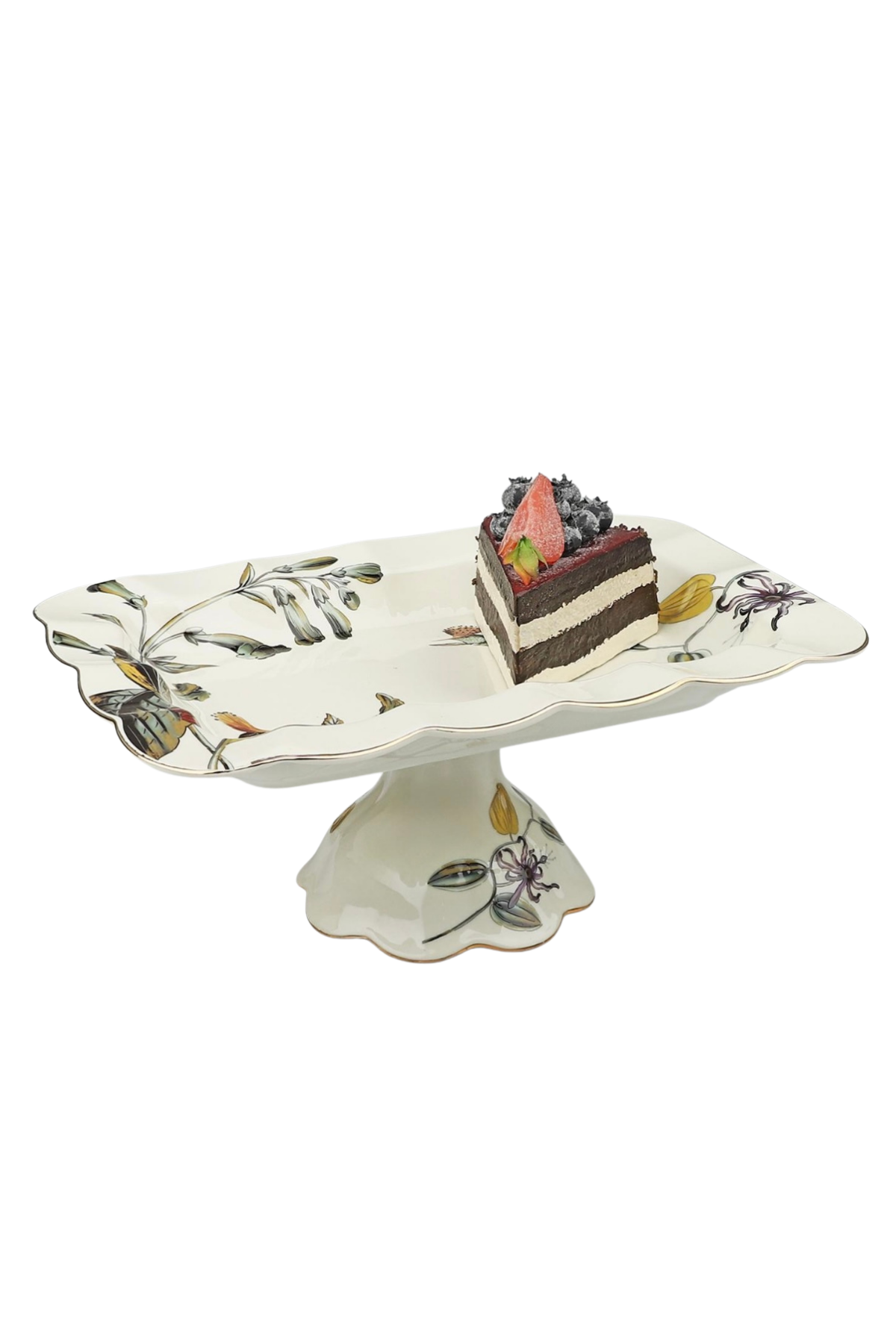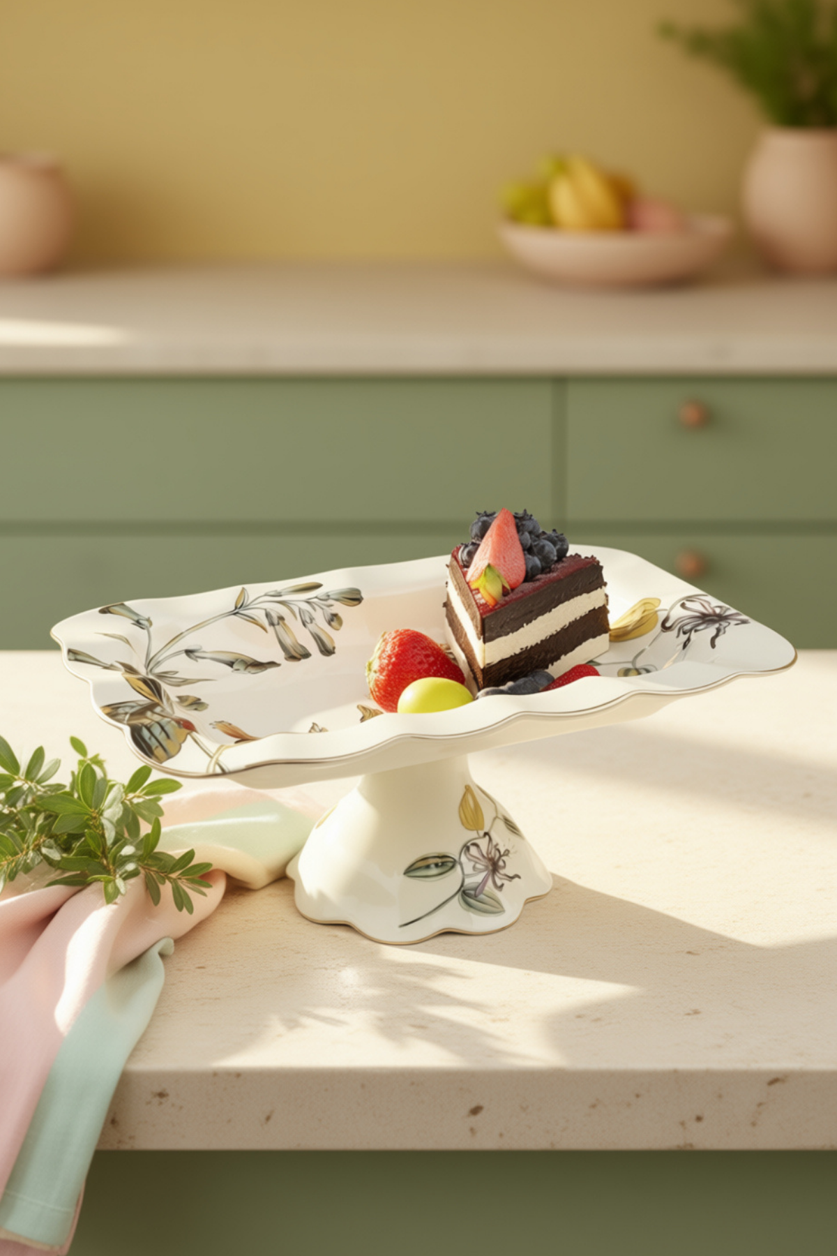 Botanica ayaklı porselen sunum standı, modern ve klasik dekorların tümüne uyum sağlayan doğal ve zarif çizgileriyle öne çıkar. Geniş yüzeyi sayesinde kek, pasta, cheesecake, kurabiye ve ikramlıklarınızı şık bir şekilde sergilemenize olanak tanır.