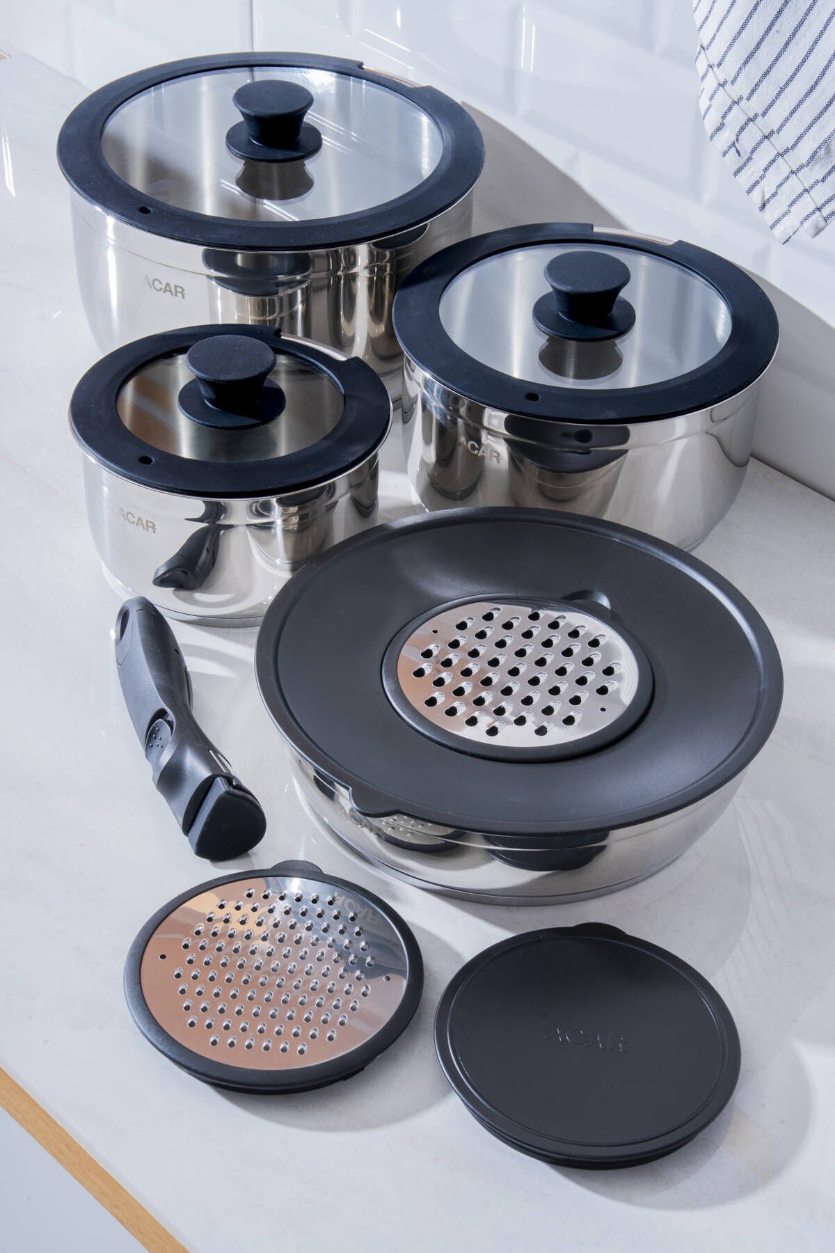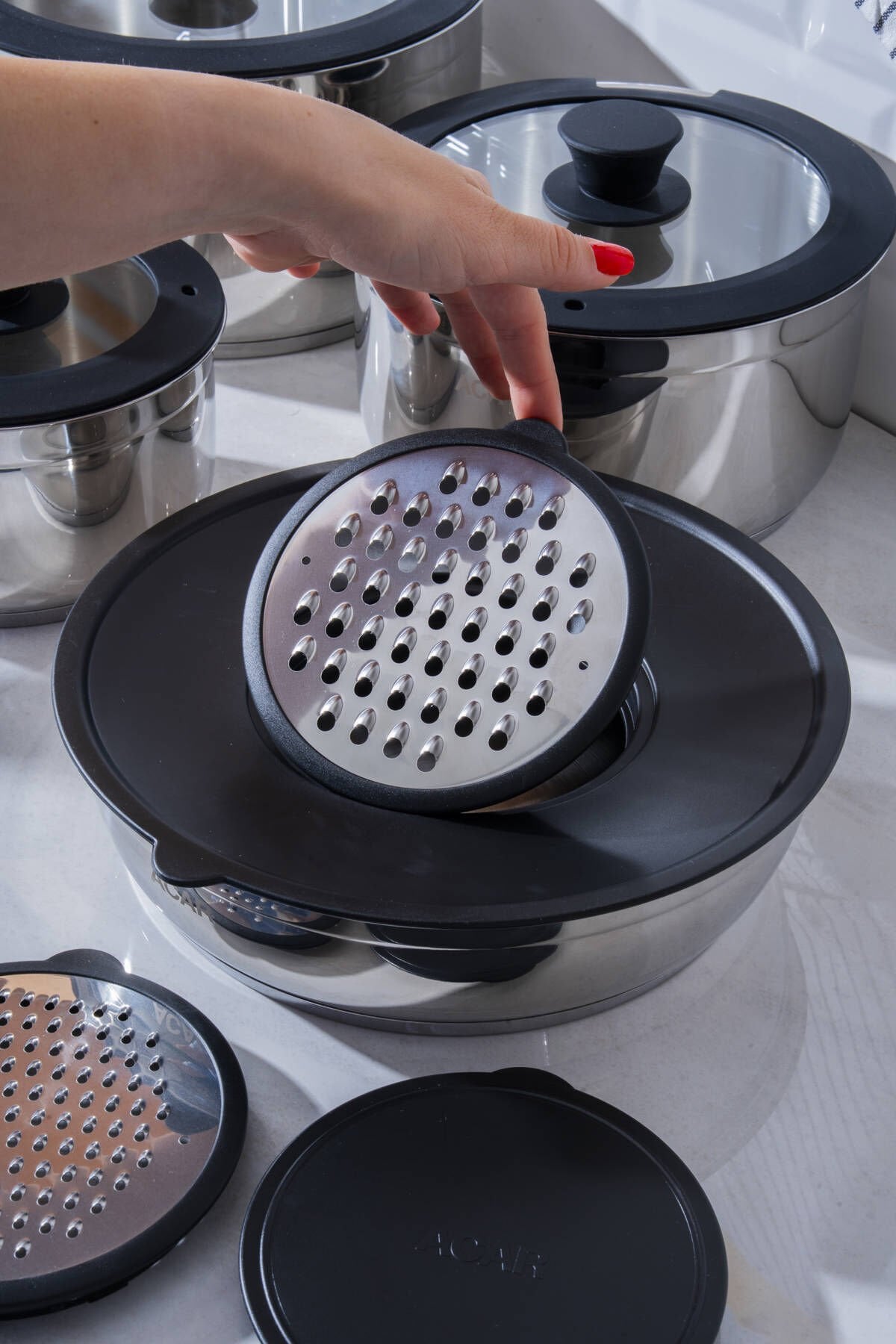 - المحتويات: 4 أواني (16، 20، 24 سم)، 3 أغطية زجاجية، 1 غطاء تخزين، 2 ملحقات للشبكة، 1 مقبض قابل للإزالة