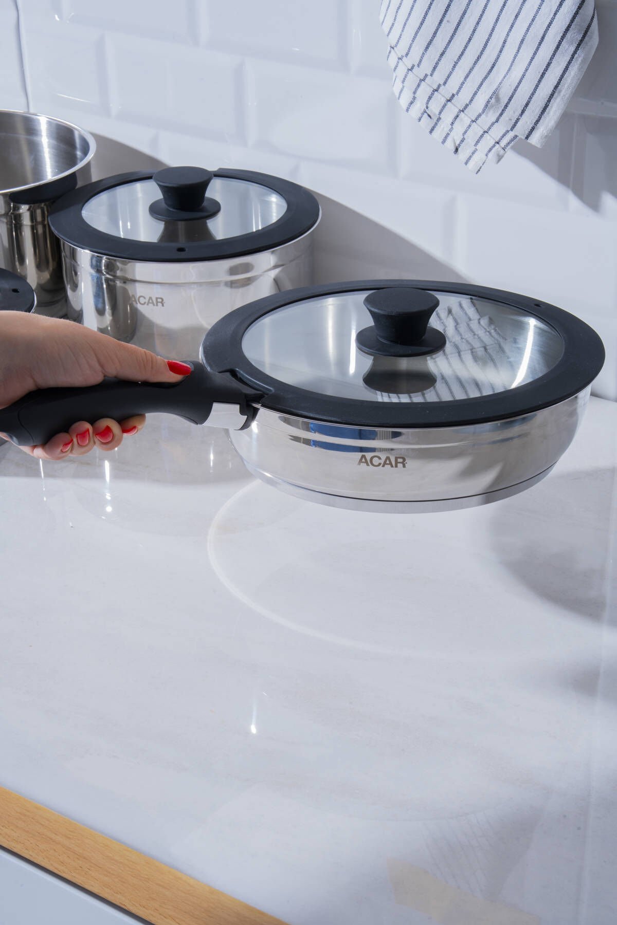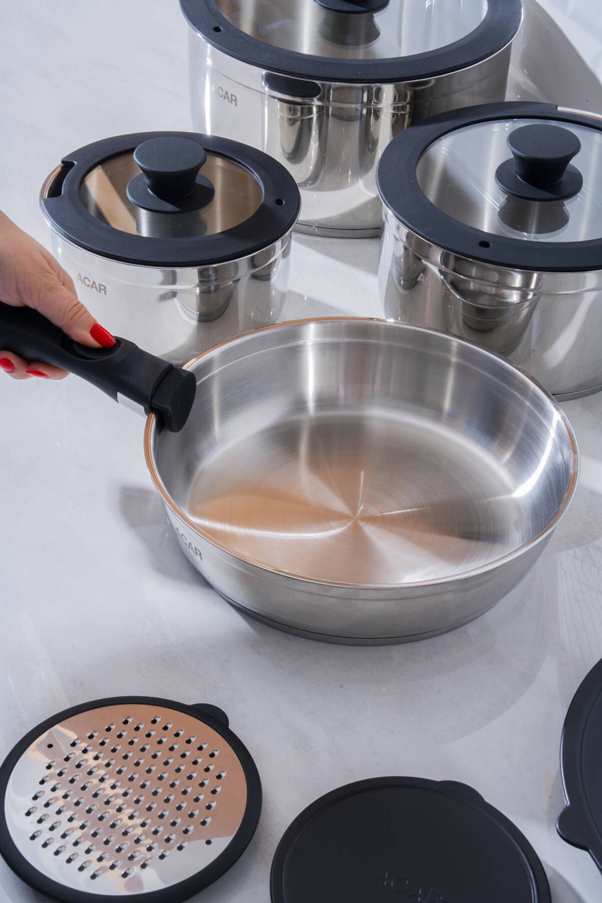 طقم أواني طهي مارس الفولاذية، المكون من ١٢ قطعة، متعدد الاستخدامات يجمع بين الأناقة والعملية. أحجام أواني متنوعة، ومقابض قابلة للإزالة، ونظام أغطية خاص، توفر عملية في المطبخ. ملحقات الشبكة وأغطية التخزين تُسهّل كل خطوة، من تحضير الطعام إلى تخزينه.