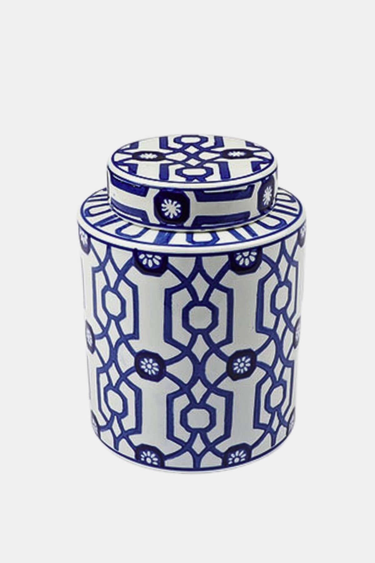 جرة أسطوانية من البورسلين، بمقاس 15.5×20.5 سم، بنقوش زرقاء داكنة، تُضفي لمسةً زخرفيةً راقية بنقوشها الكلاسيكية الزرقاء والبيضاء. شكلها الأسطواني المستدير وغطاؤها يُضفيان عليها لمسةً جماليةً وعملية.