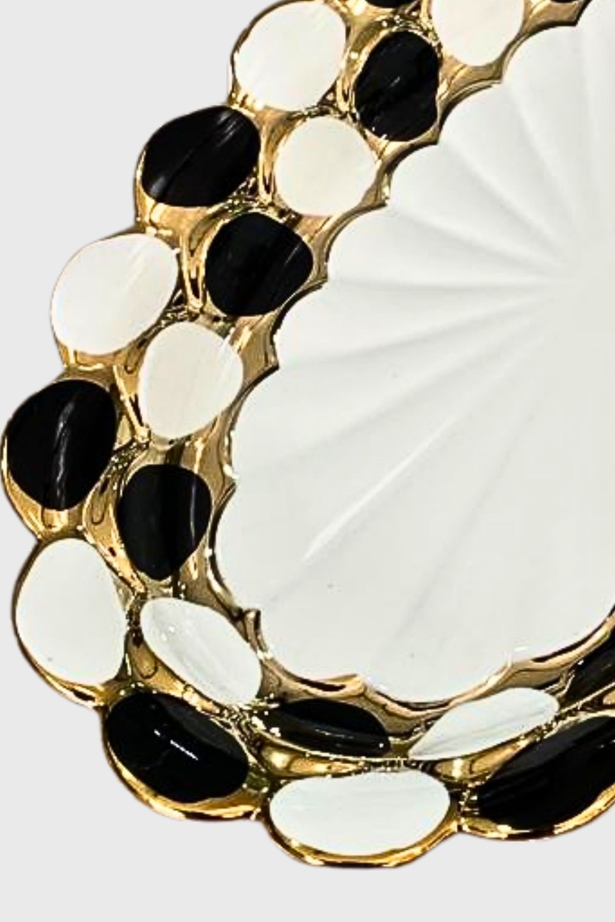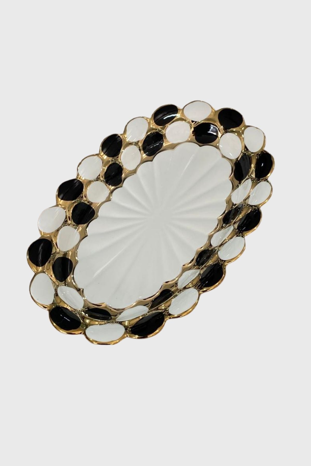 Monochrome Luxe serisinin ikonik siyah–beyaz kontrastı ile altın yaldız detaylarını buluşturan bu porselen oval tabak, modern ve lüks sunumların vazgeçilmez parçası olarak öne çıkar. Zarif formu, yüksek kaliteli porselen dokusu ve göz alıcı desen çerçevesiyle hem günlük kullanımda hem de özel davet sofralarında şıklığı en üst seviyeye taşır.