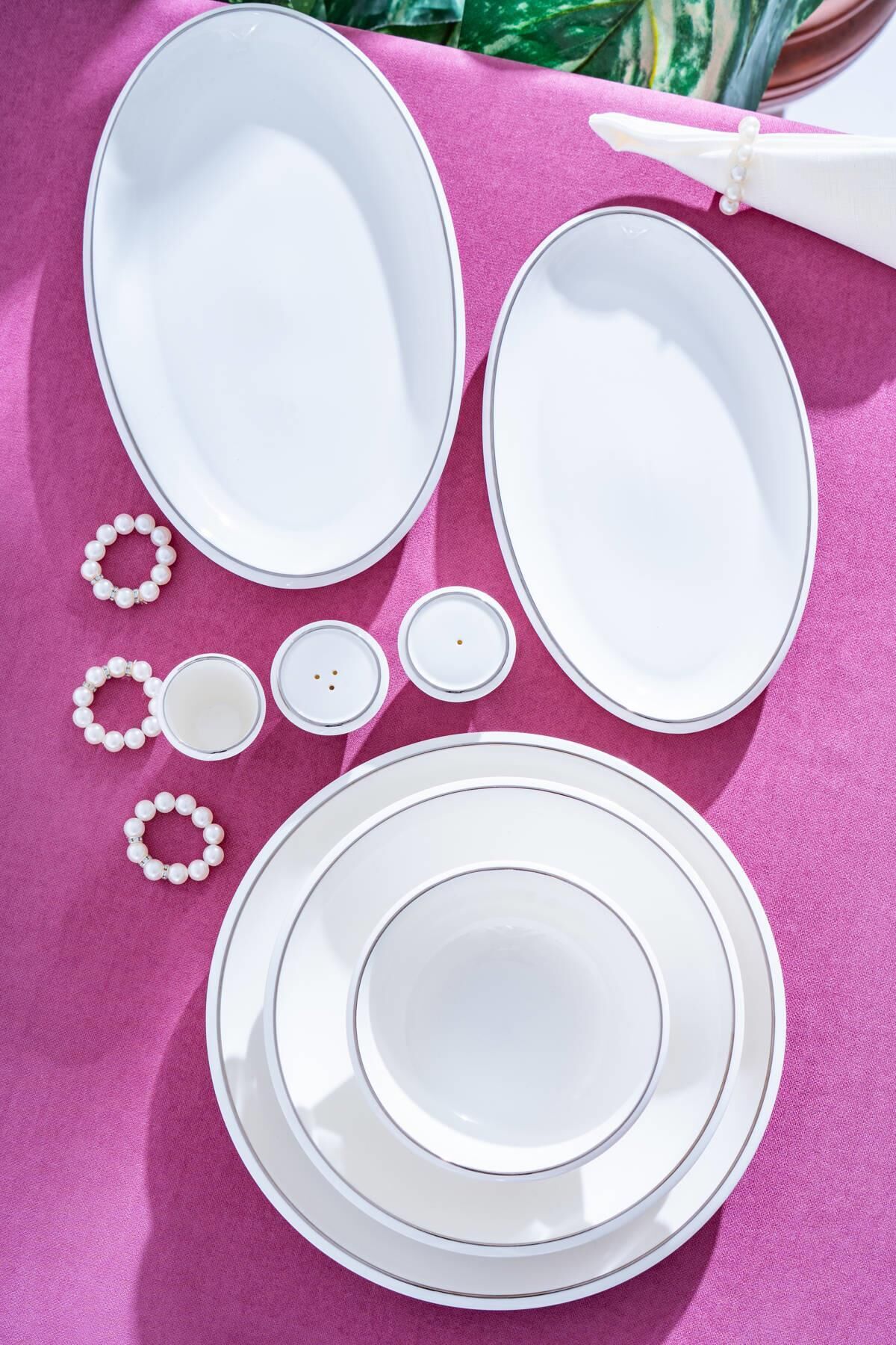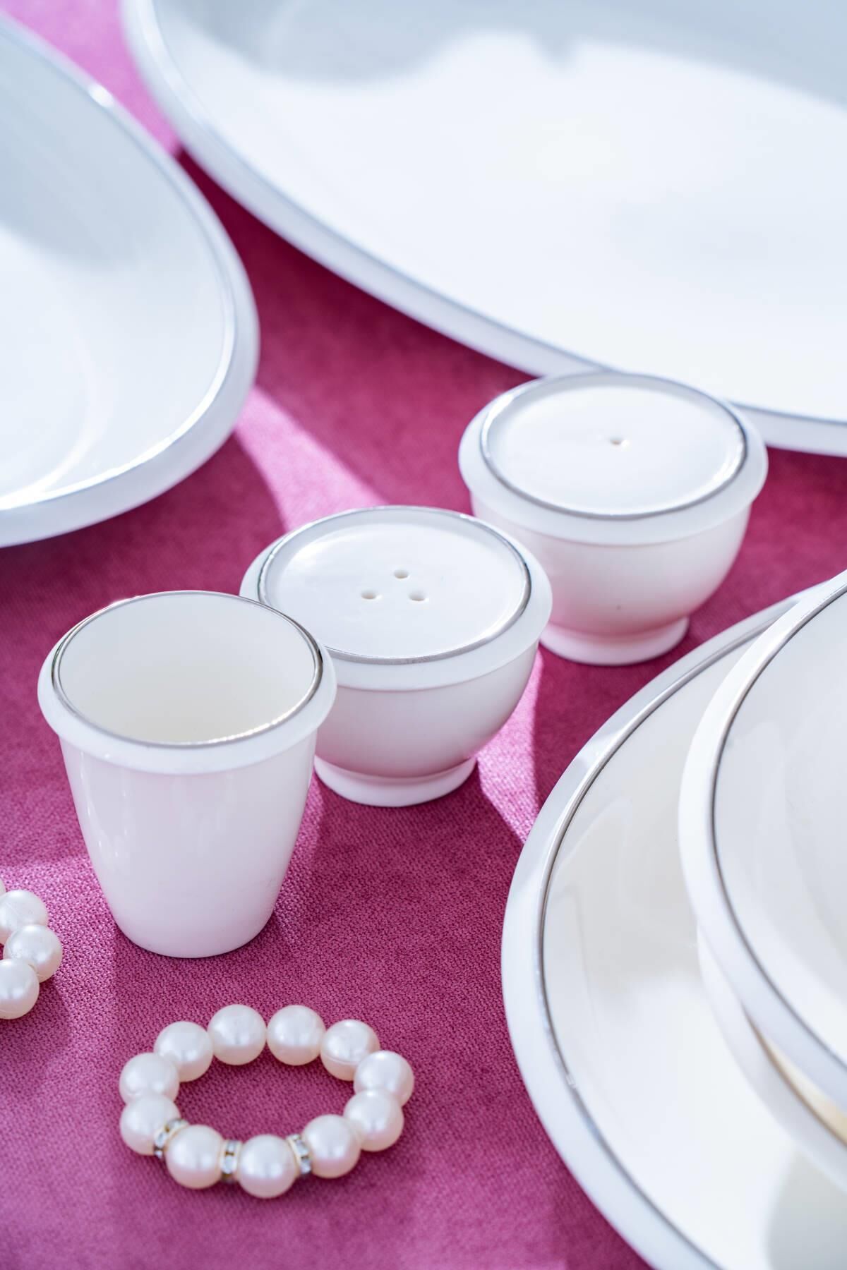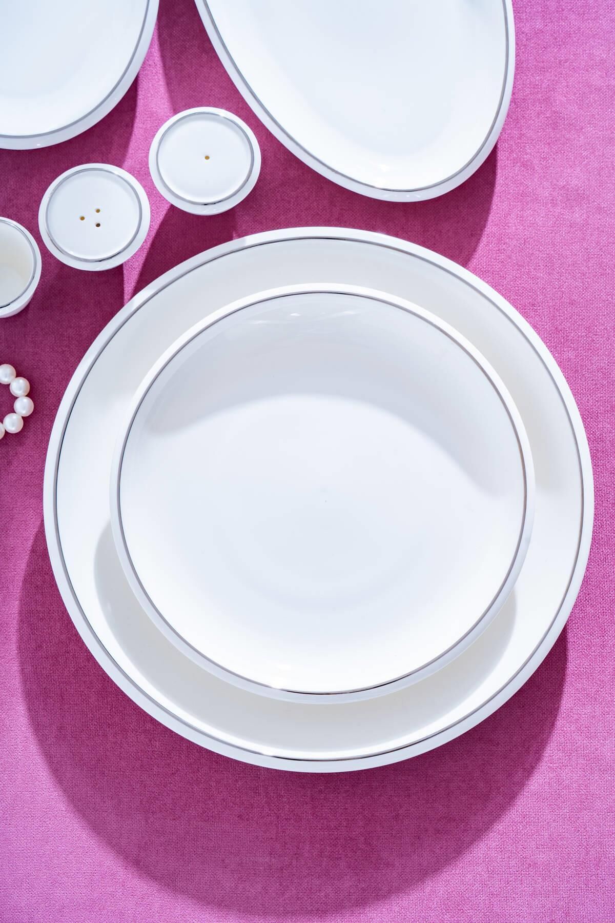 طقم عشاء ويلهايد ، بتصميمه العصري والأنيق، يُضفي لمسةً من البساطة على الطاولة. سعته الكبيرة التي تتسع لـ 12 شخصًا تُضفي لمسةً من الأناقة على أي طاولة، سواءً للاستخدام اليومي أو للمناسبات الخاصة. يمتزج الملمس الأبيض الطبيعي للخزف مع التفاصيل الفضية لإضفاء مظهرٍ أنيق.