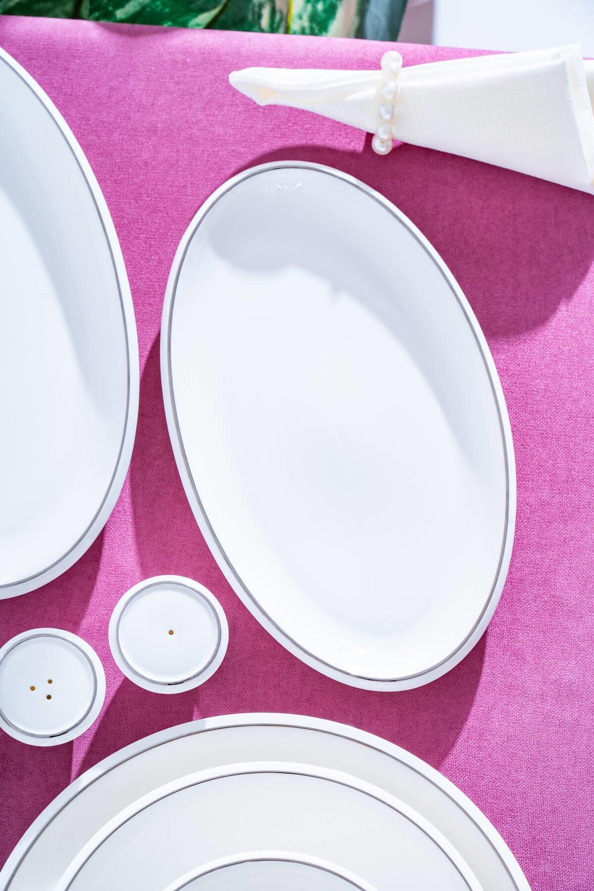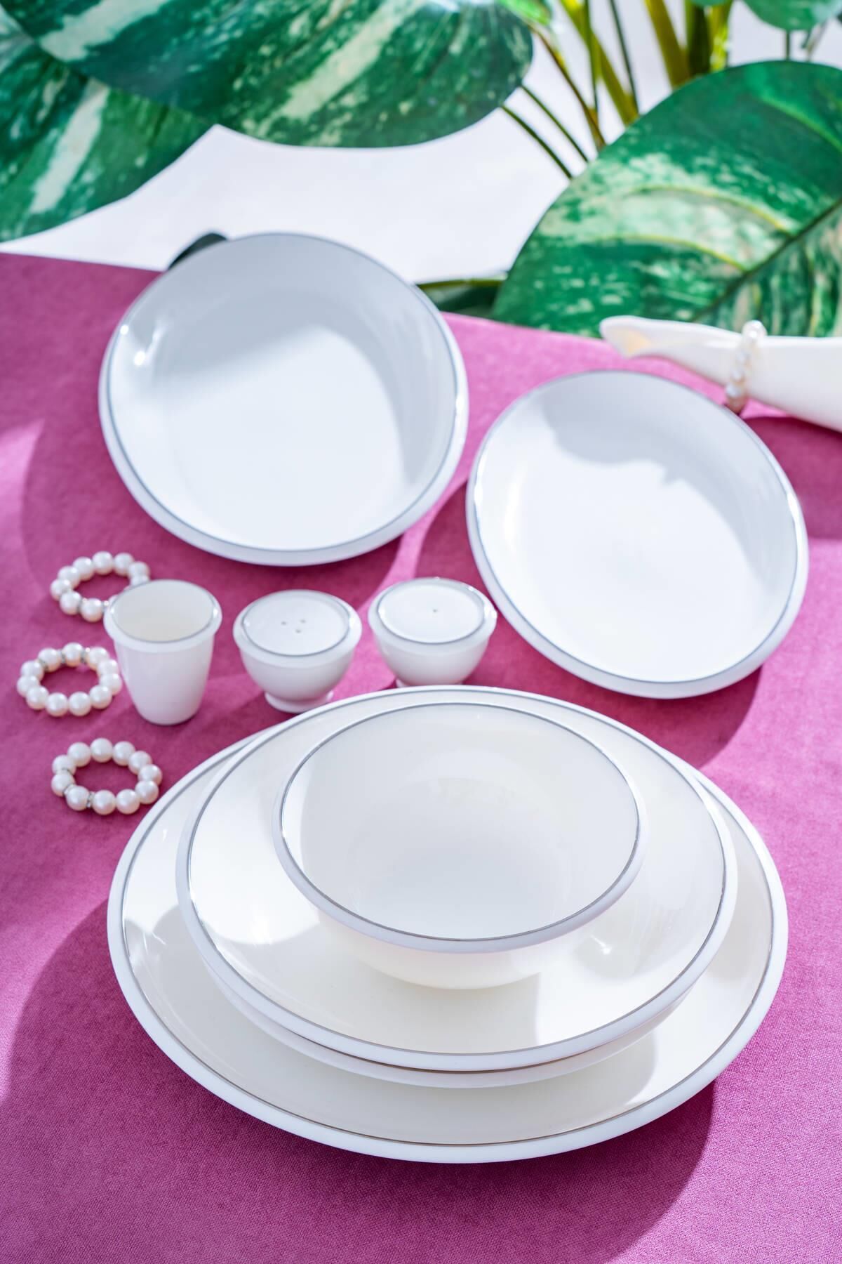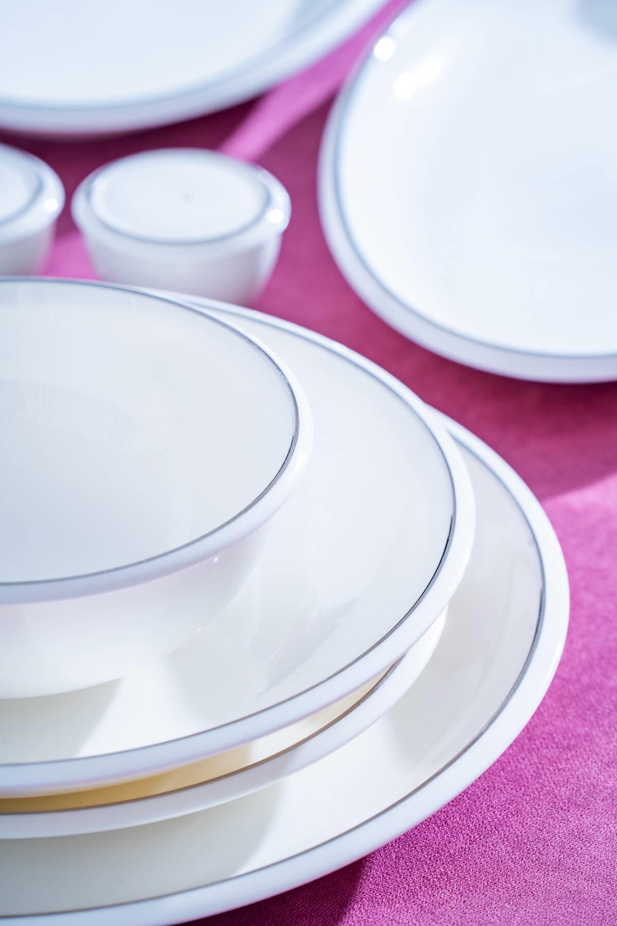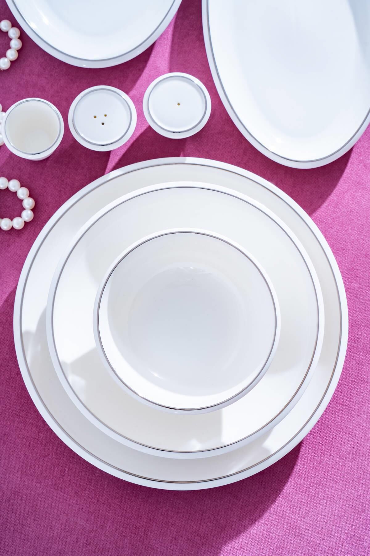 طقم عشاء ويلهايد ، بتصميمه العصري والأنيق، يُضفي لمسةً من البساطة على الطاولة. سعته الكبيرة التي تتسع لـ 12 شخصًا تُضفي لمسةً من الأناقة على أي طاولة، سواءً للاستخدام اليومي أو للمناسبات الخاصة. يمتزج الملمس الأبيض الطبيعي للخزف مع التفاصيل الفضية لإضفاء مظهرٍ أنيق.