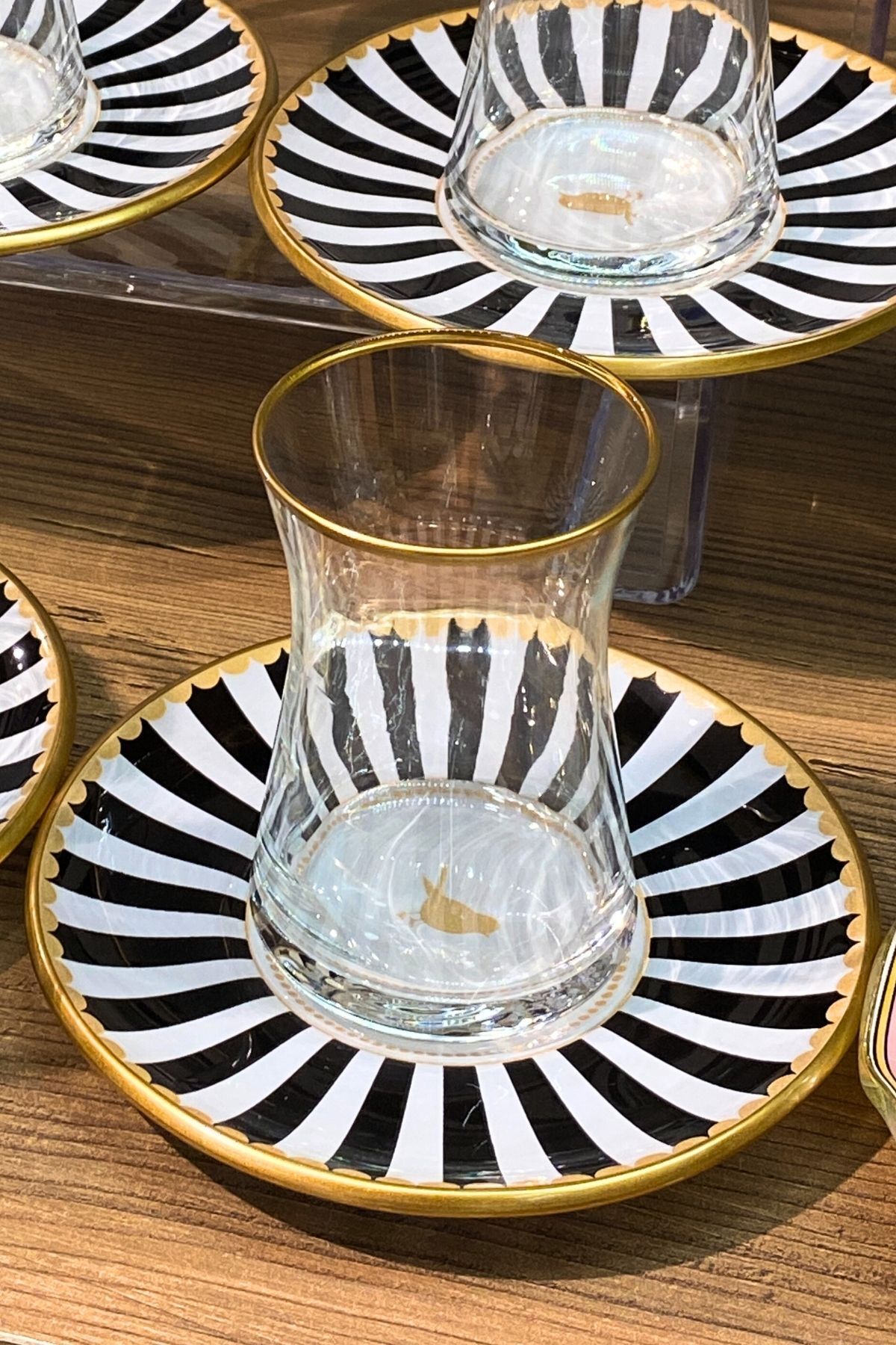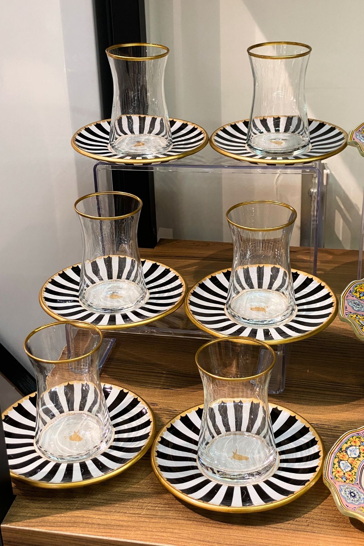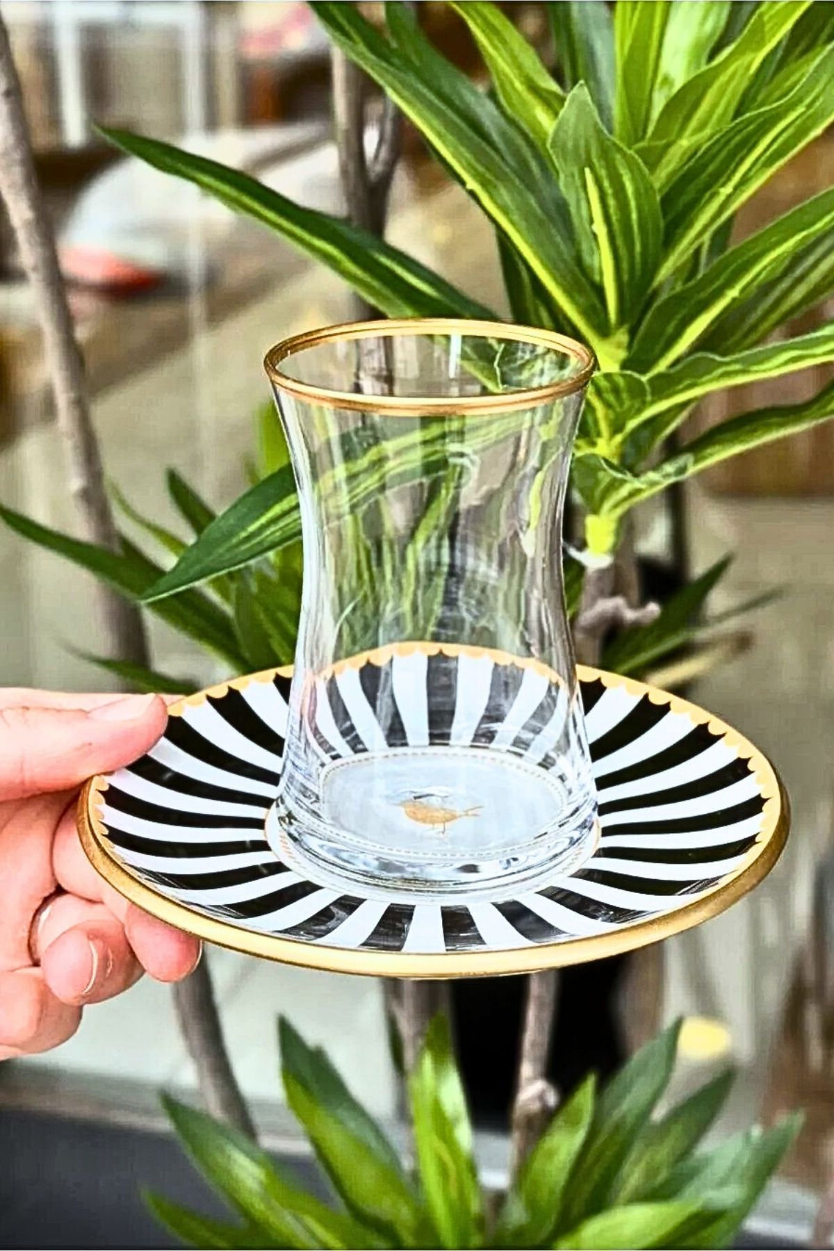 Şık çizgili tabakları ve gold detaylı ince belli bardaklarıyla modern ve elegant bir sunum sağlar. Günlük kullanıma uygun, misafir ağırlamalarında göz alıcı bir dokunuş katar.