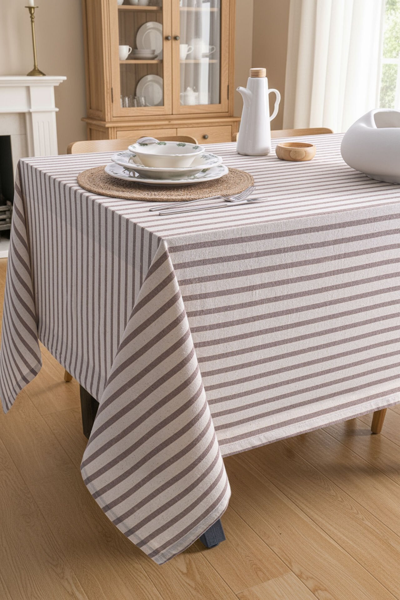The Brown Striped Linen Tablecloth, 160x220 cm , brings natural elegance and a warm atmosphere to your table. The breathable texture of linen, combined with its durability and simple elegance, creates an aesthetically pleasing look for any table setting, from everyday use to special occasions.