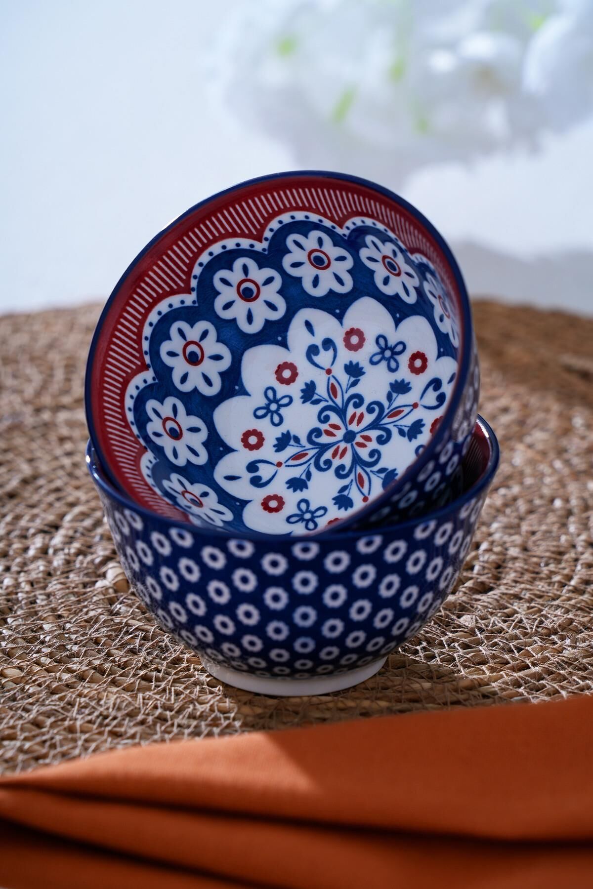 The Elsie Round Bowl brings a touch of natural beauty and vibrancy to your table with its elegant floral patterns. The collection's signature red and navy blue hues, combined with simple white porcelain, create a warm and inviting atmosphere for any presentation. Measuring 10 cm, this mini bowl is the ideal size for serving sauces, jams, appetizers, or snacks.