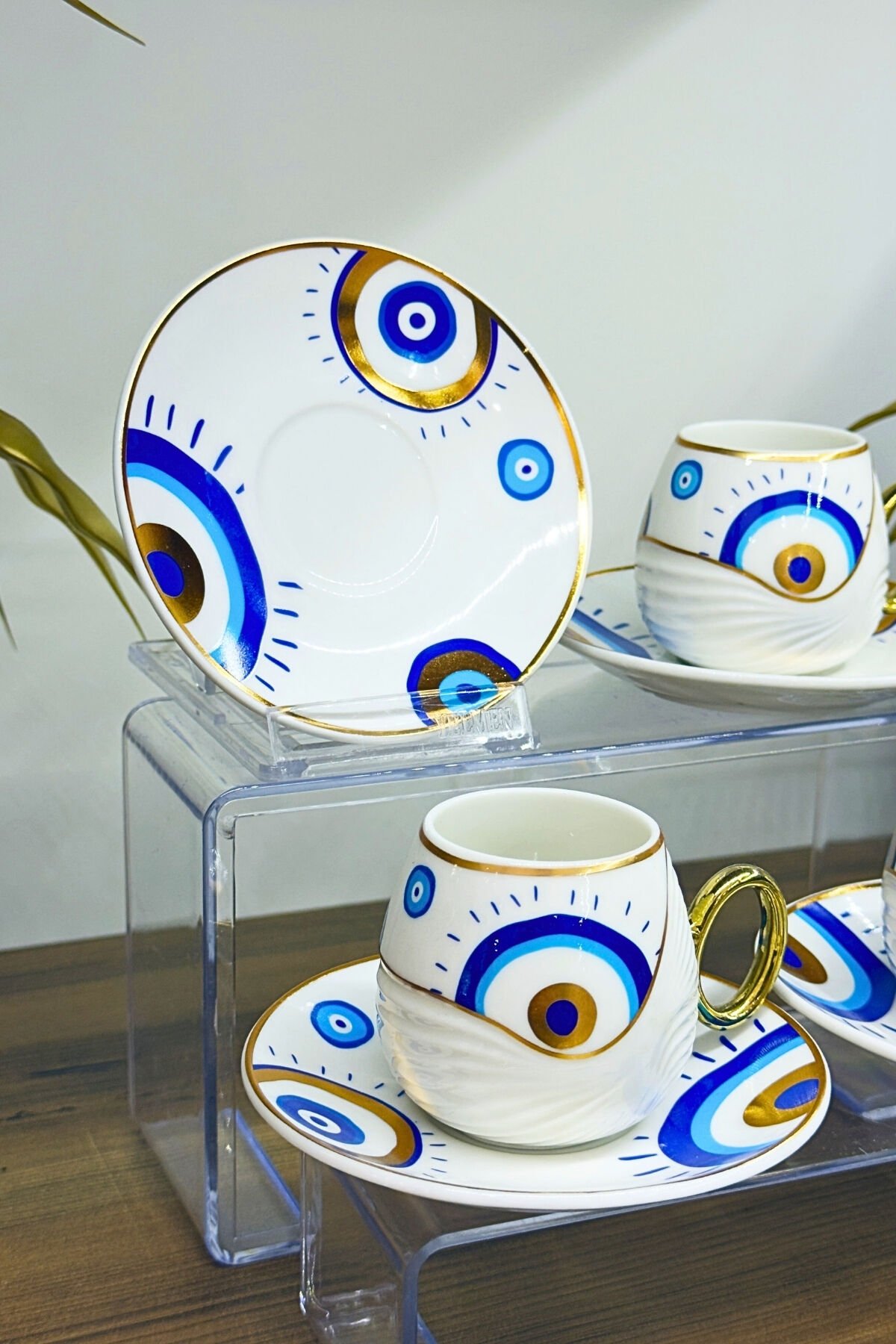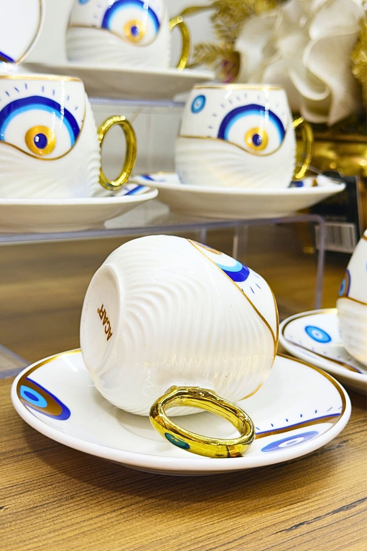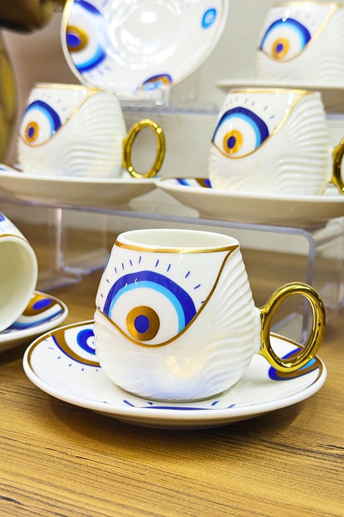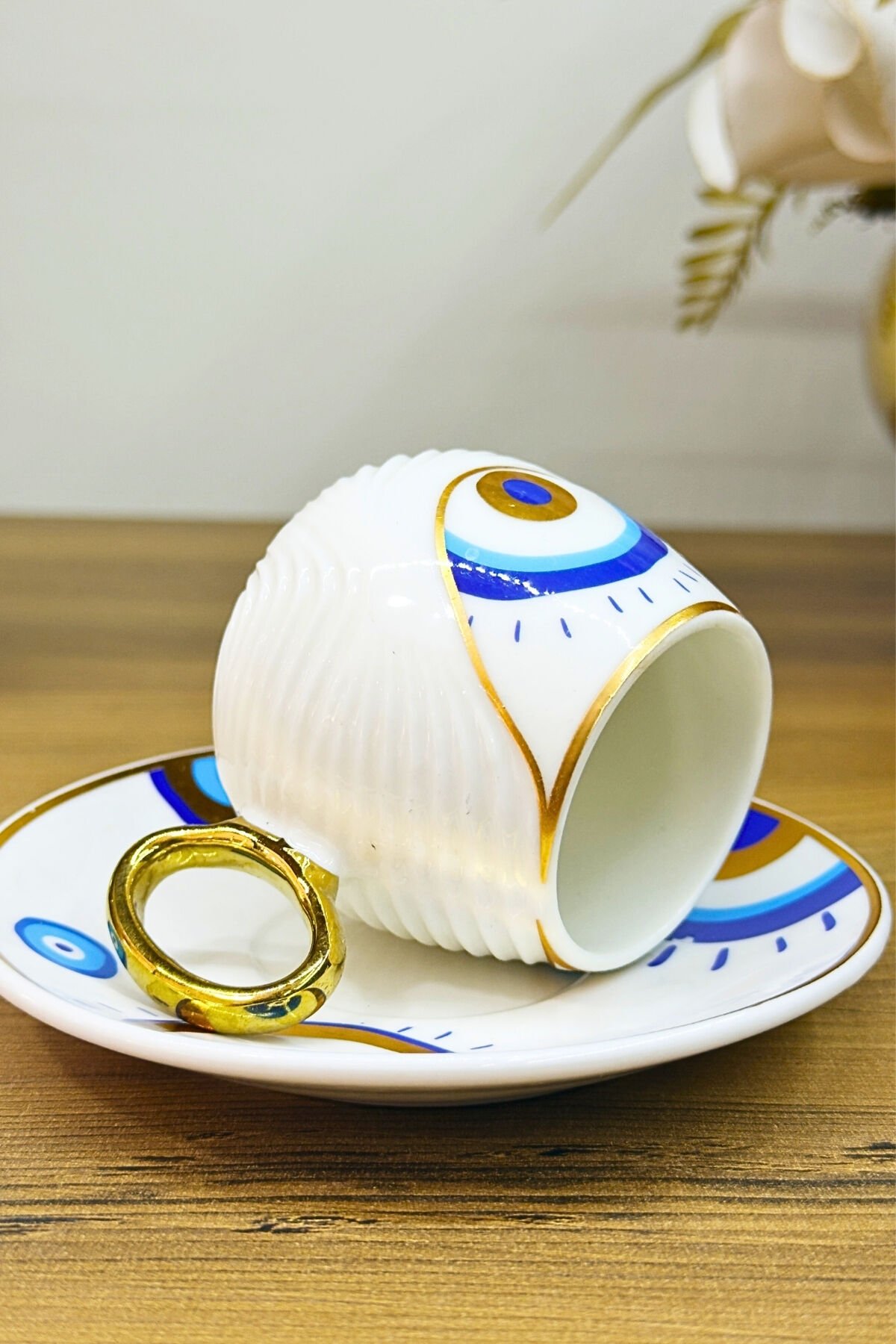 The Evil Eye Gold-Edged Turkish Coffee Cup Set for 6 offers a modern interpretation of the traditional symbol of the evil eye. Evil eye motifs and subtle gold-rim details on a white porcelain base add both a protective symbol and a luxurious sparkle to your coffee offerings.