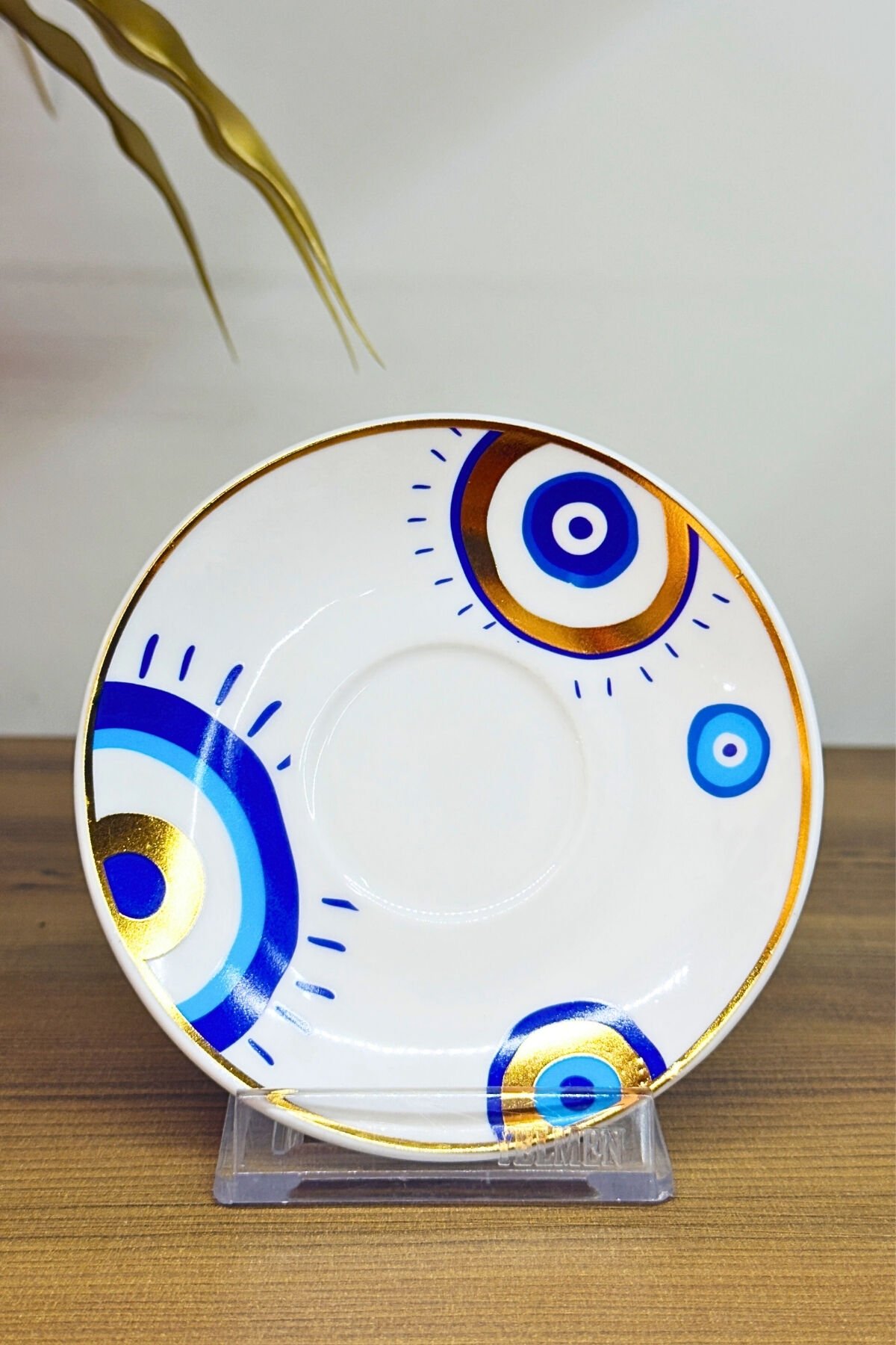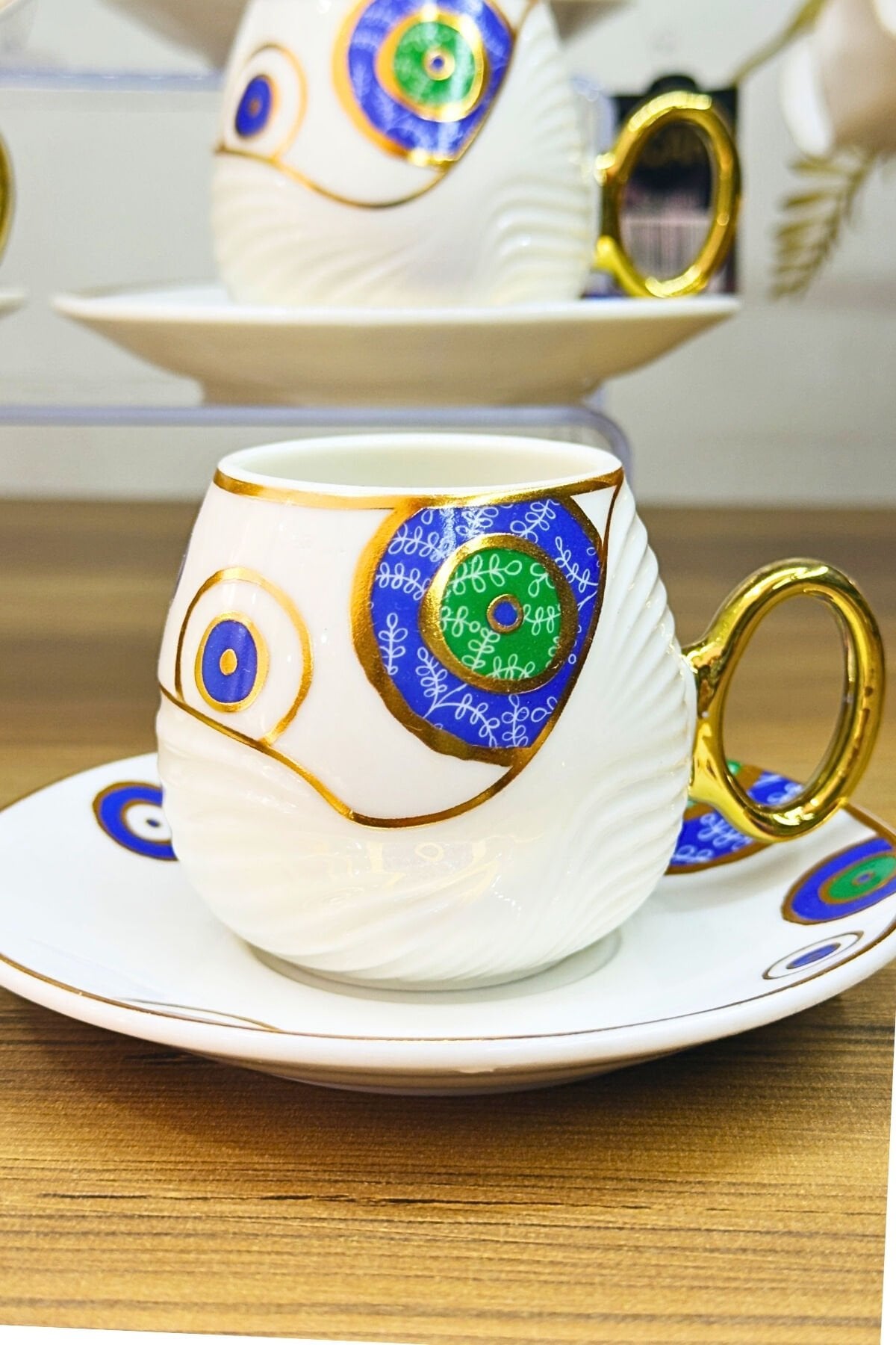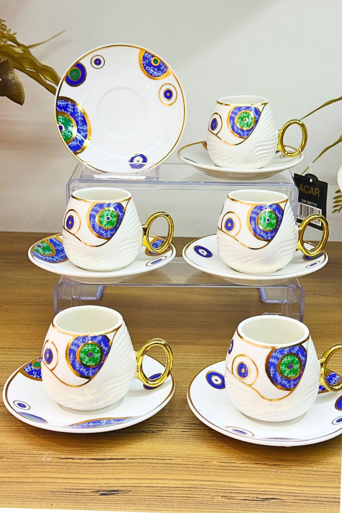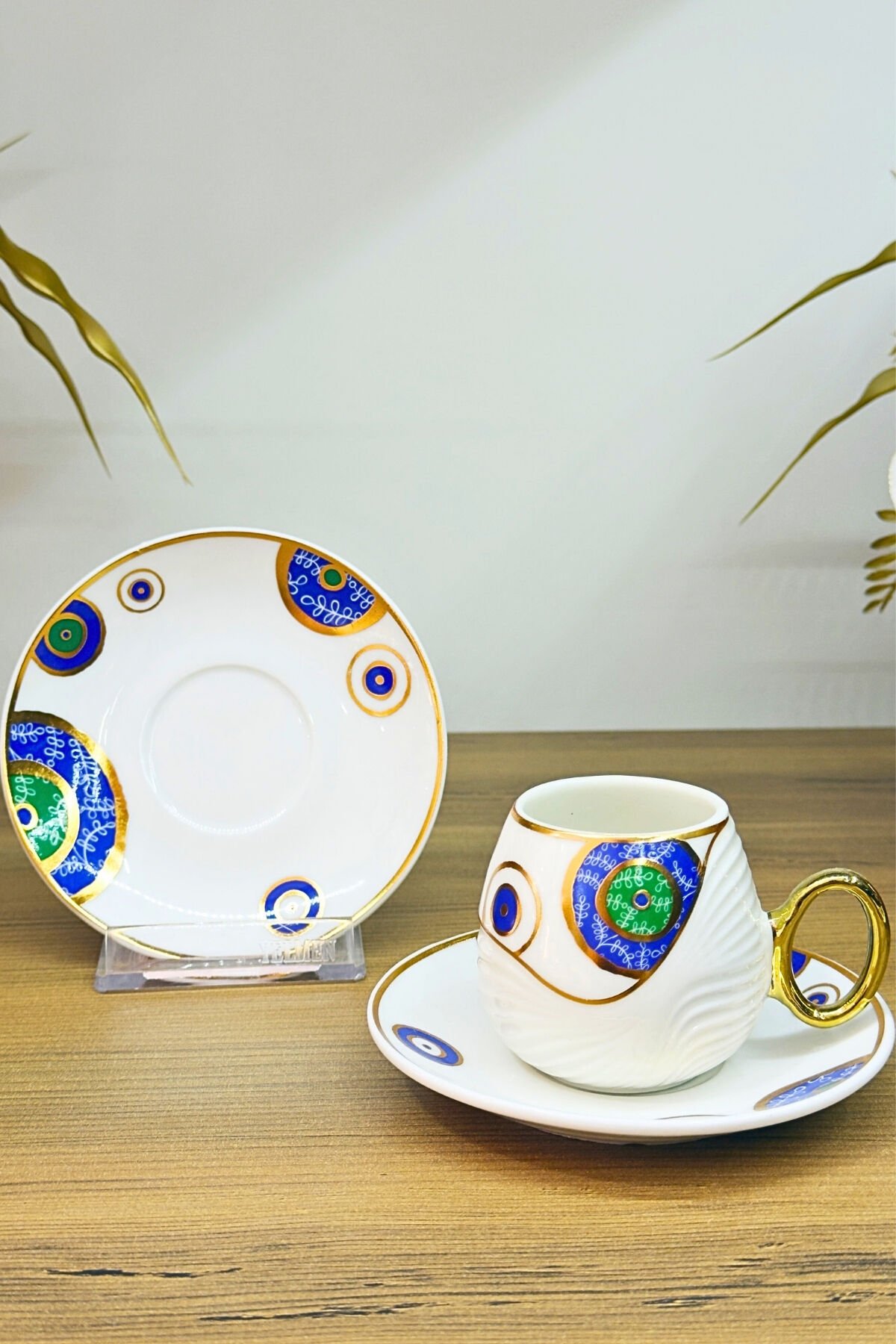 The Evil Eye Gold-Edged Turkish Coffee Cup Set for 6 offers a modern interpretation of the traditional symbol of the evil eye. Evil eye motifs and subtle gold-rim details on a white porcelain base add both a protective symbol and a luxurious sparkle to your coffee offerings.