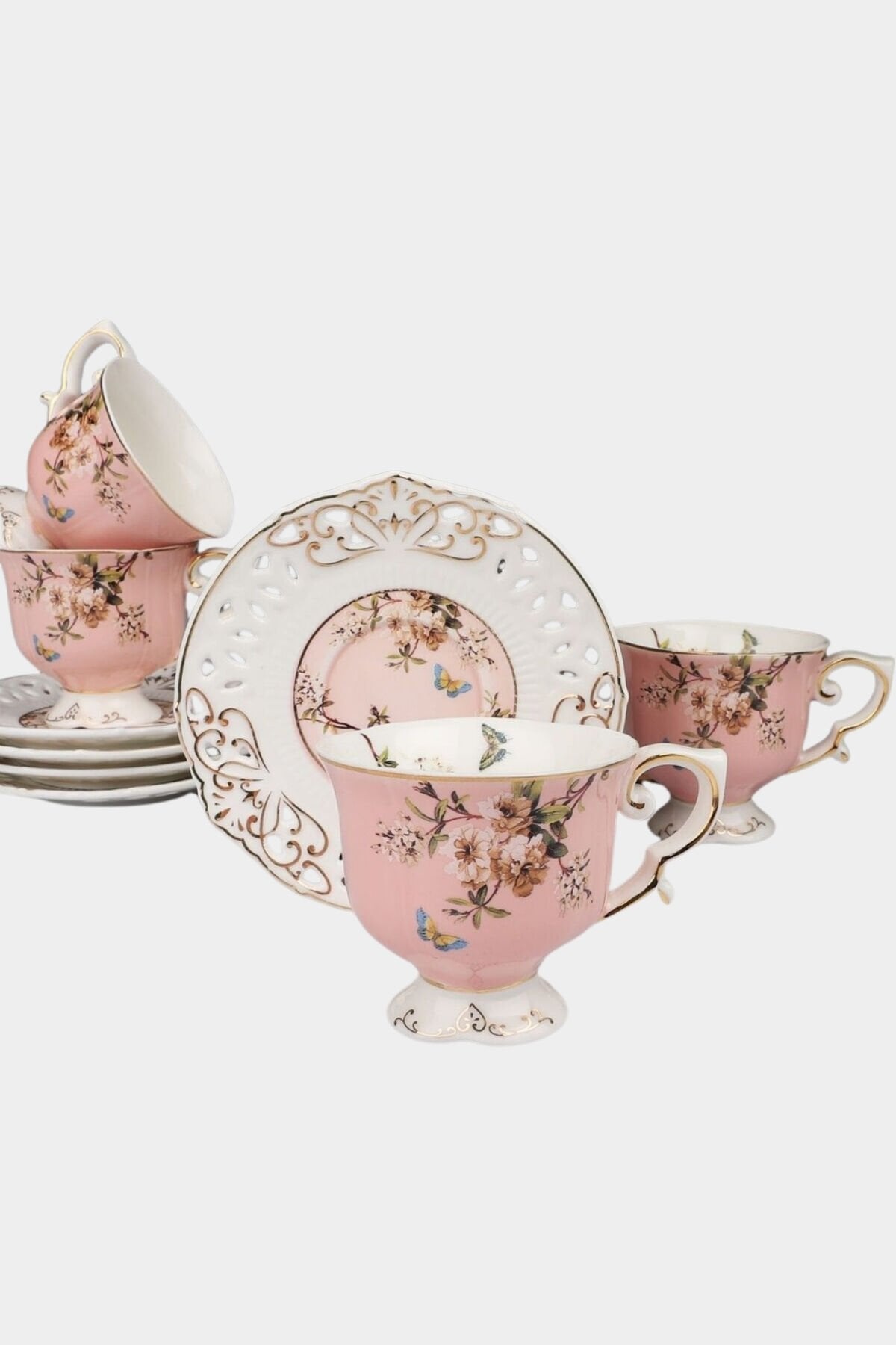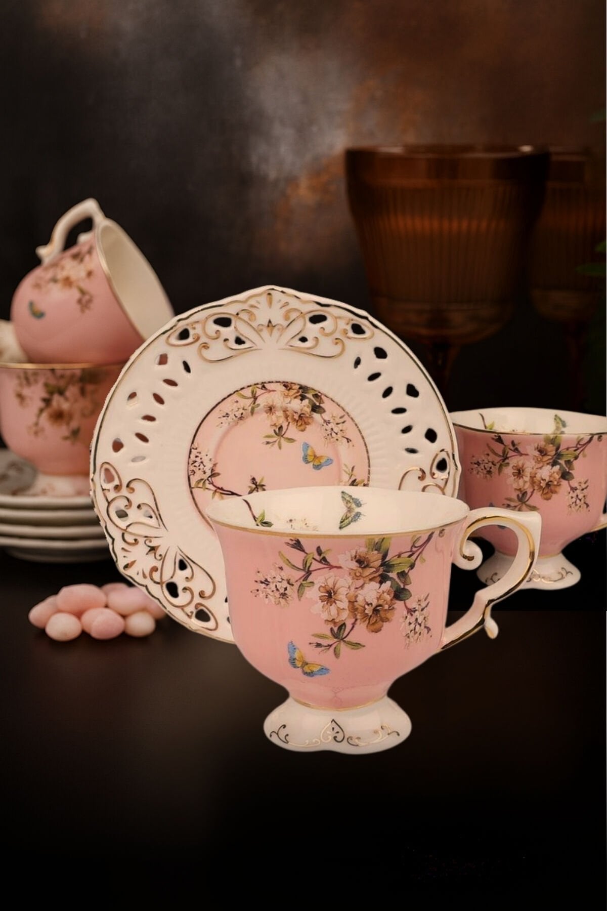 Inspired by nature, its elegant floral patterns, pink hues, and sparkling gold details bring elegance to your coffee. Its free-standing form creates a nostalgic and elegant presence.
