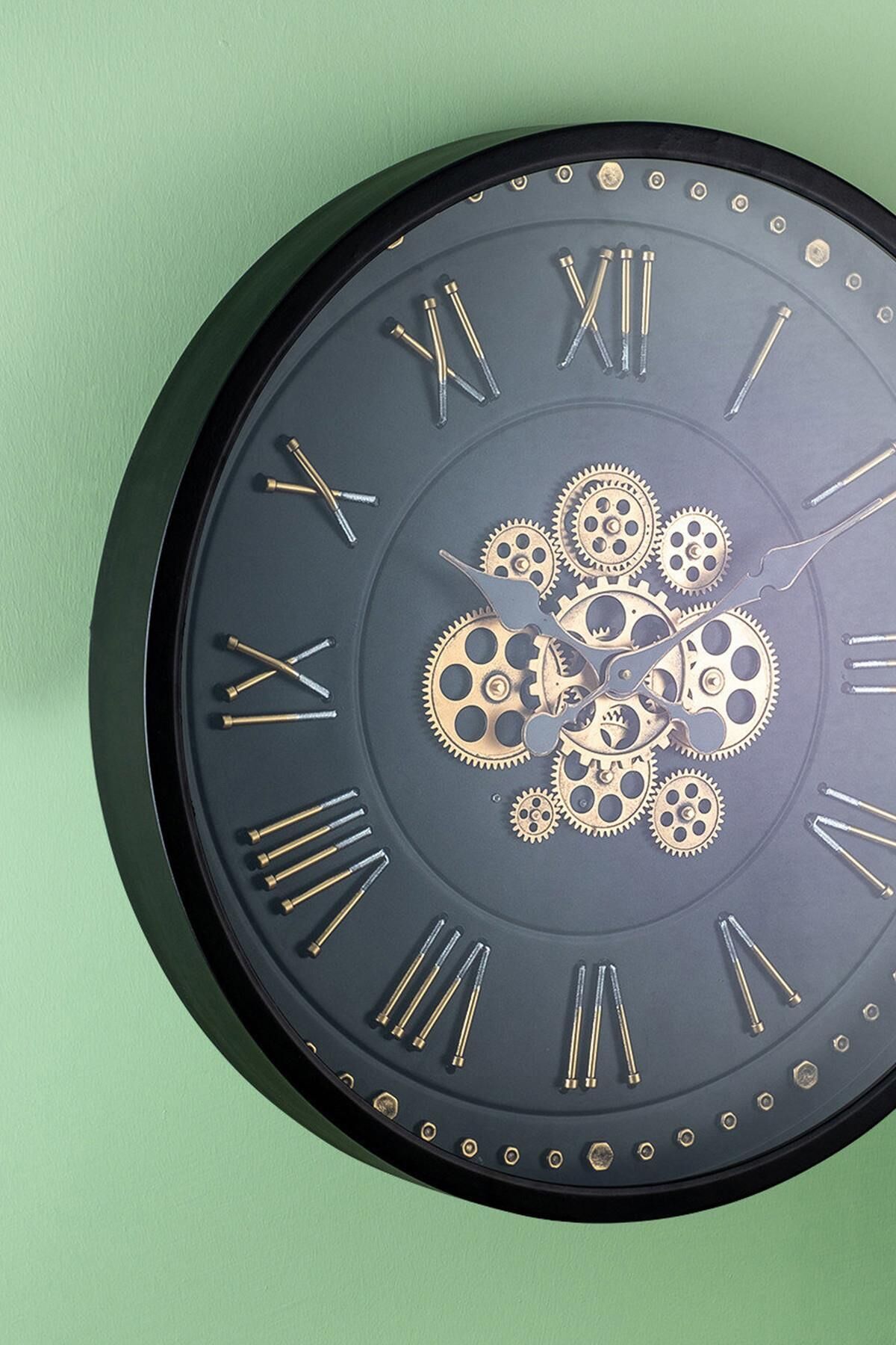 The gold-toned gears at the clock's center combine industrial style with classic Roman numerals. It creates a timeless accent in living rooms, offices, or entryways, while its shimmering details on a black background add a sophisticated depth to your wall.