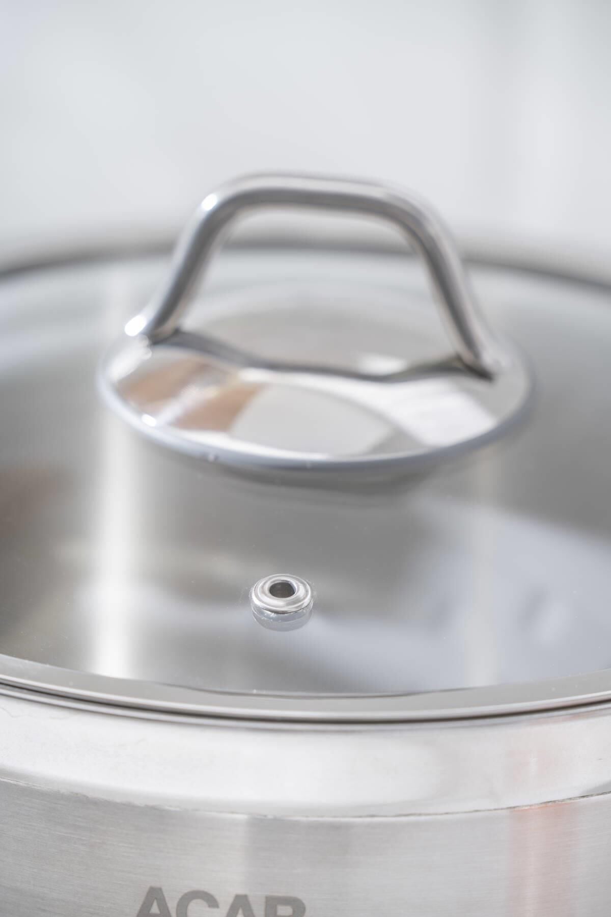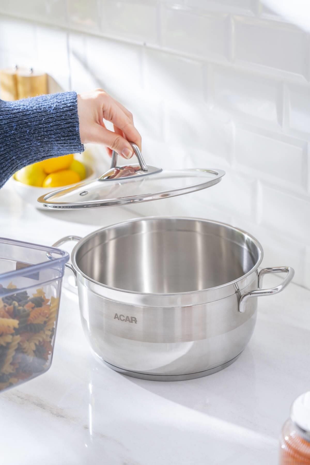 The Karat Steel Deep Casserole - 22 cm , with its high-quality stainless steel construction and glass lid, ensures long-lasting use in the kitchen. Its evenly distributed base helps you cook your meals at the ideal temperature while preserving their flavor.