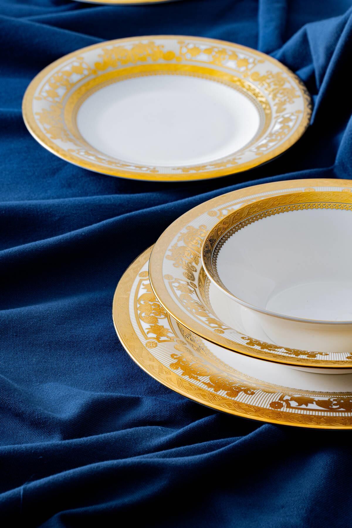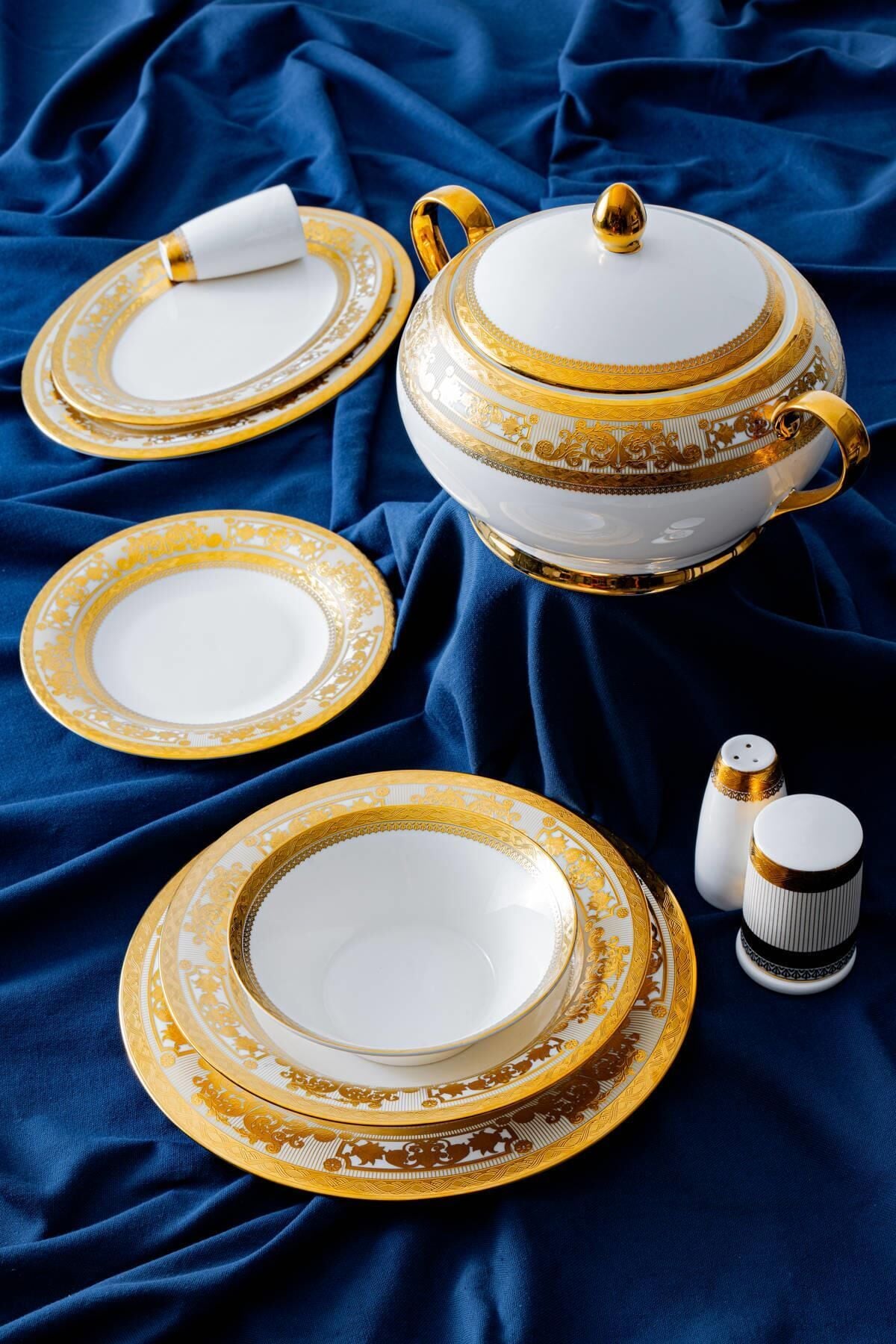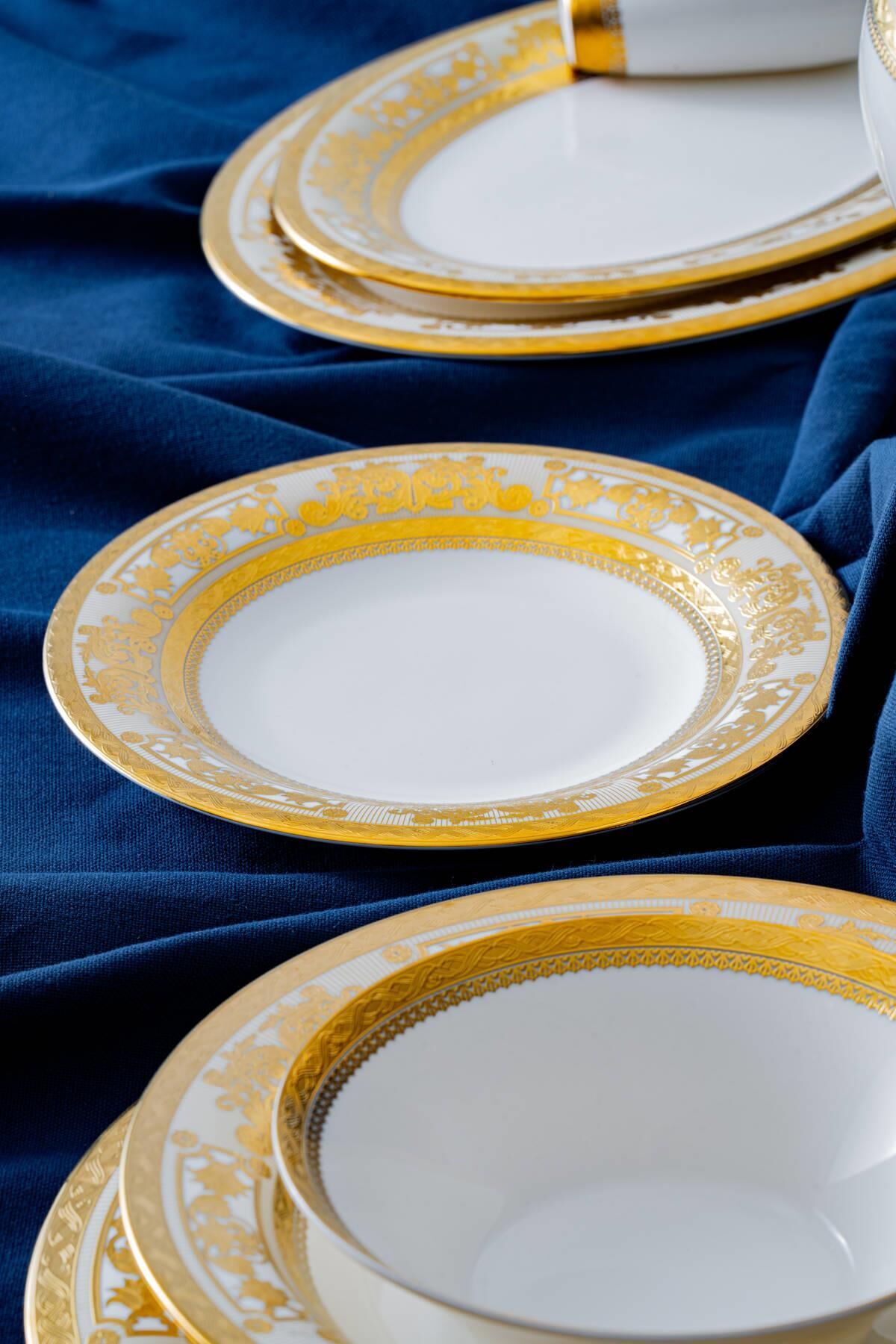 Glowing gold details against a deep navy blue background give the Morwenna collection a unique glamour. This set from Acar Home's premium series creates a dazzling atmosphere at your table.