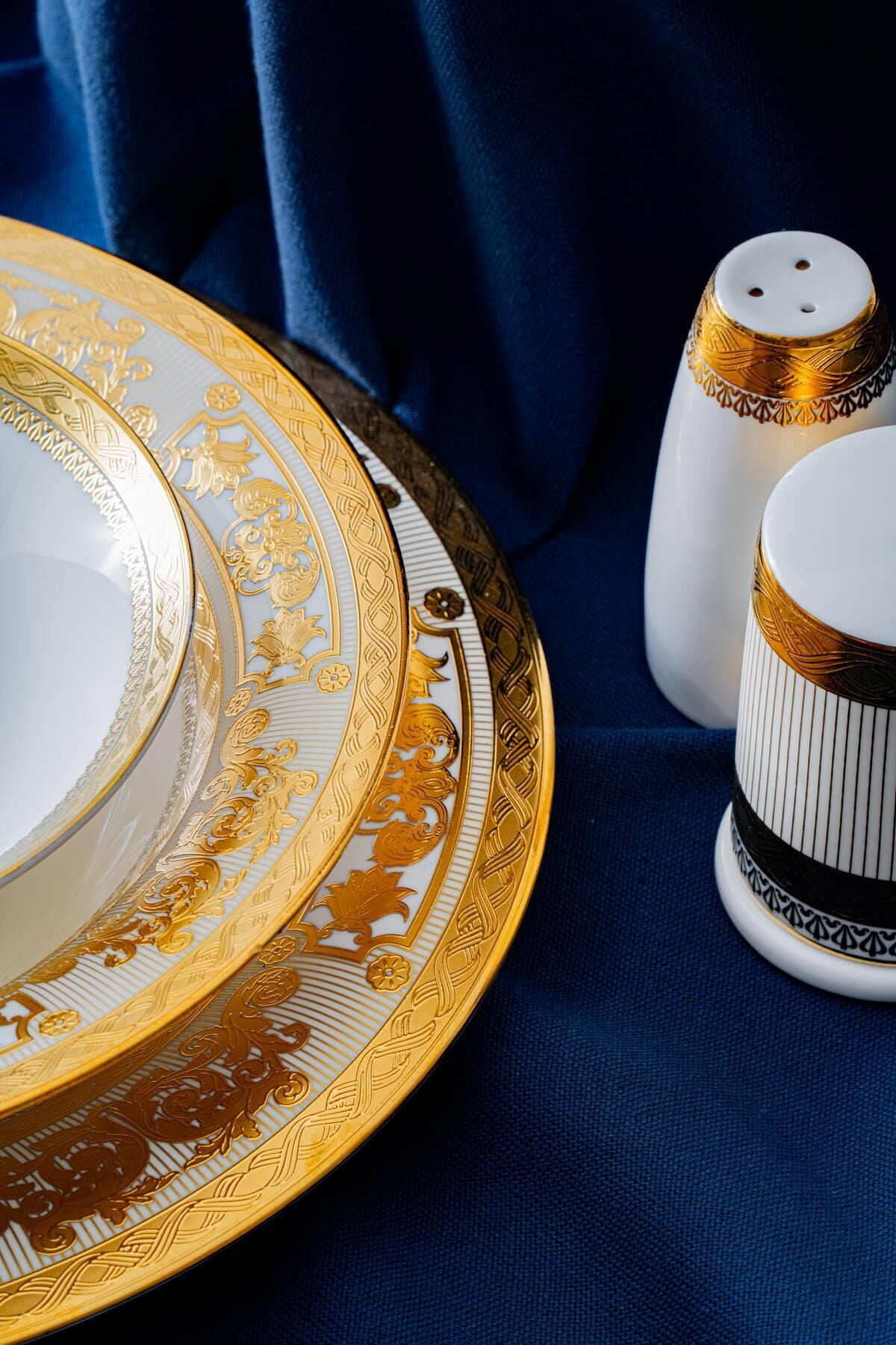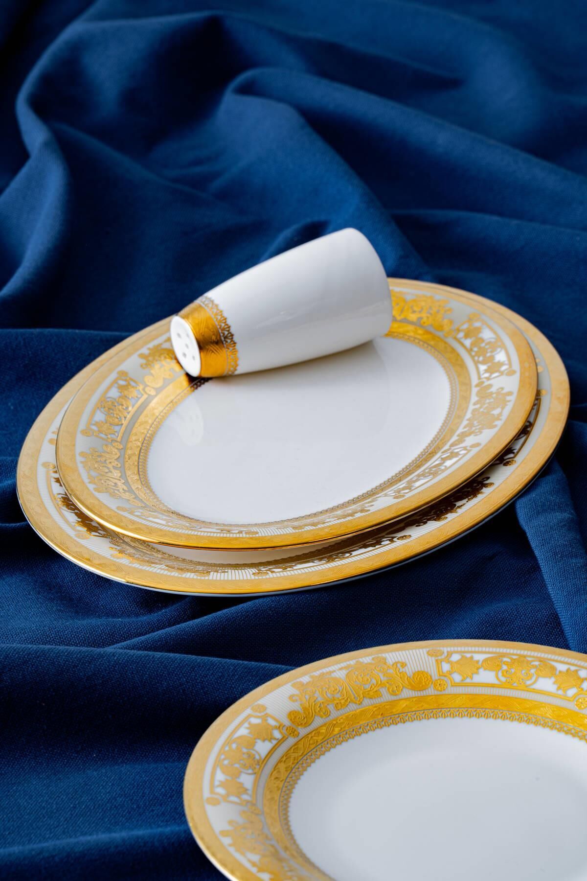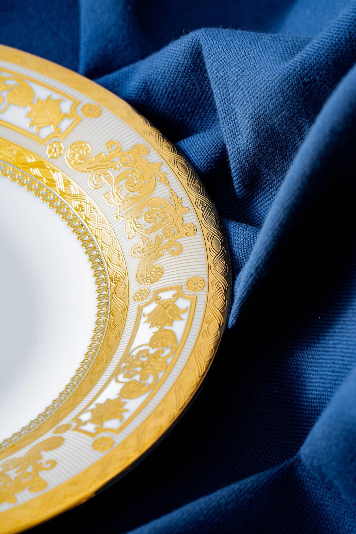 Glowing gold details against a deep navy blue background give the Morwenna collection a unique glamour. This set from Acar Home's premium series creates a dazzling atmosphere at your table.