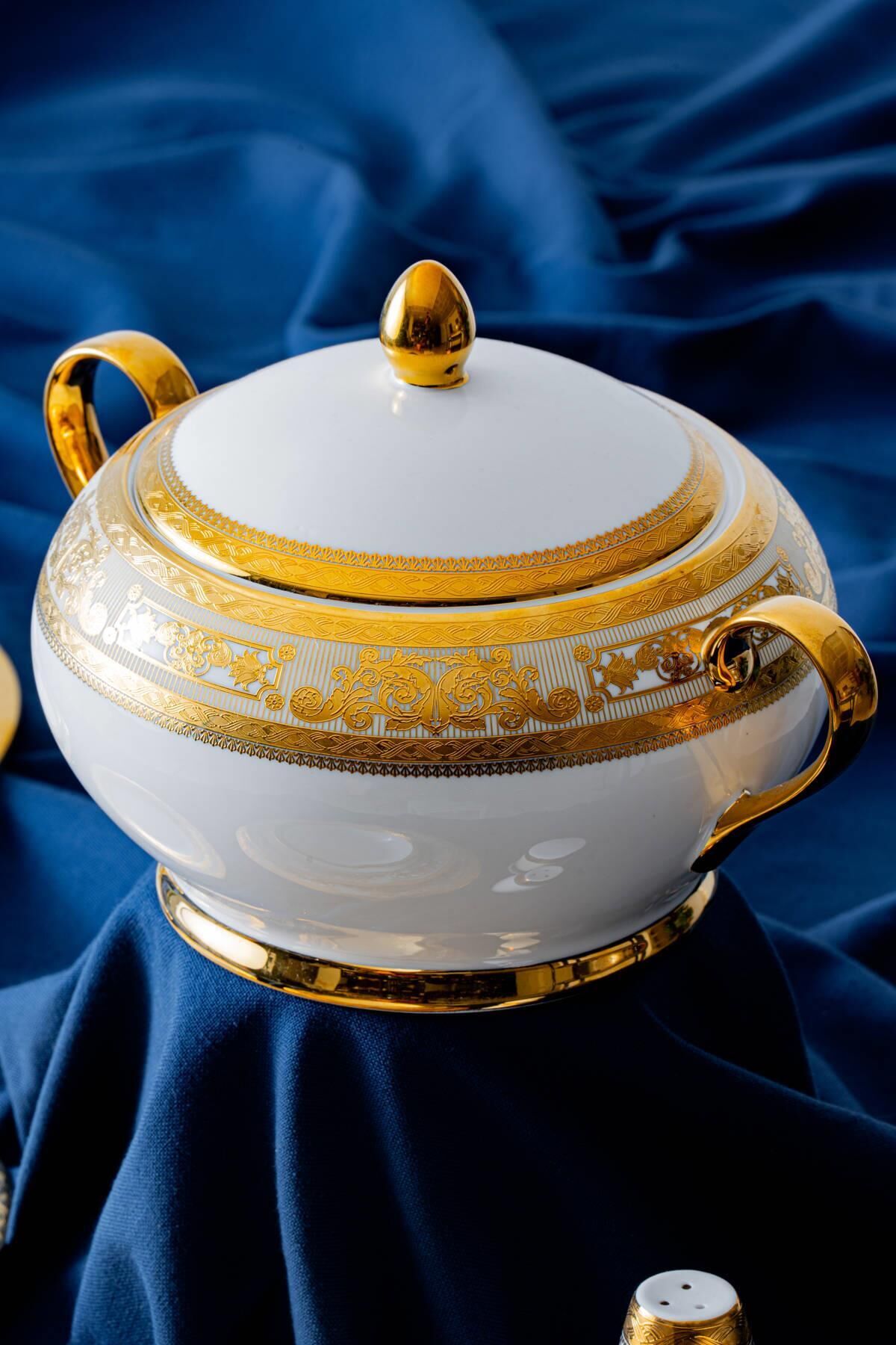 The Morwenna 12-Person 60-Piece Porcelain Dinnerware Set brings a royal sparkle to your table with its magnificent gold details and elegant patterns. Its handcrafted, gilded motifs perfectly balance classic and modern styles.