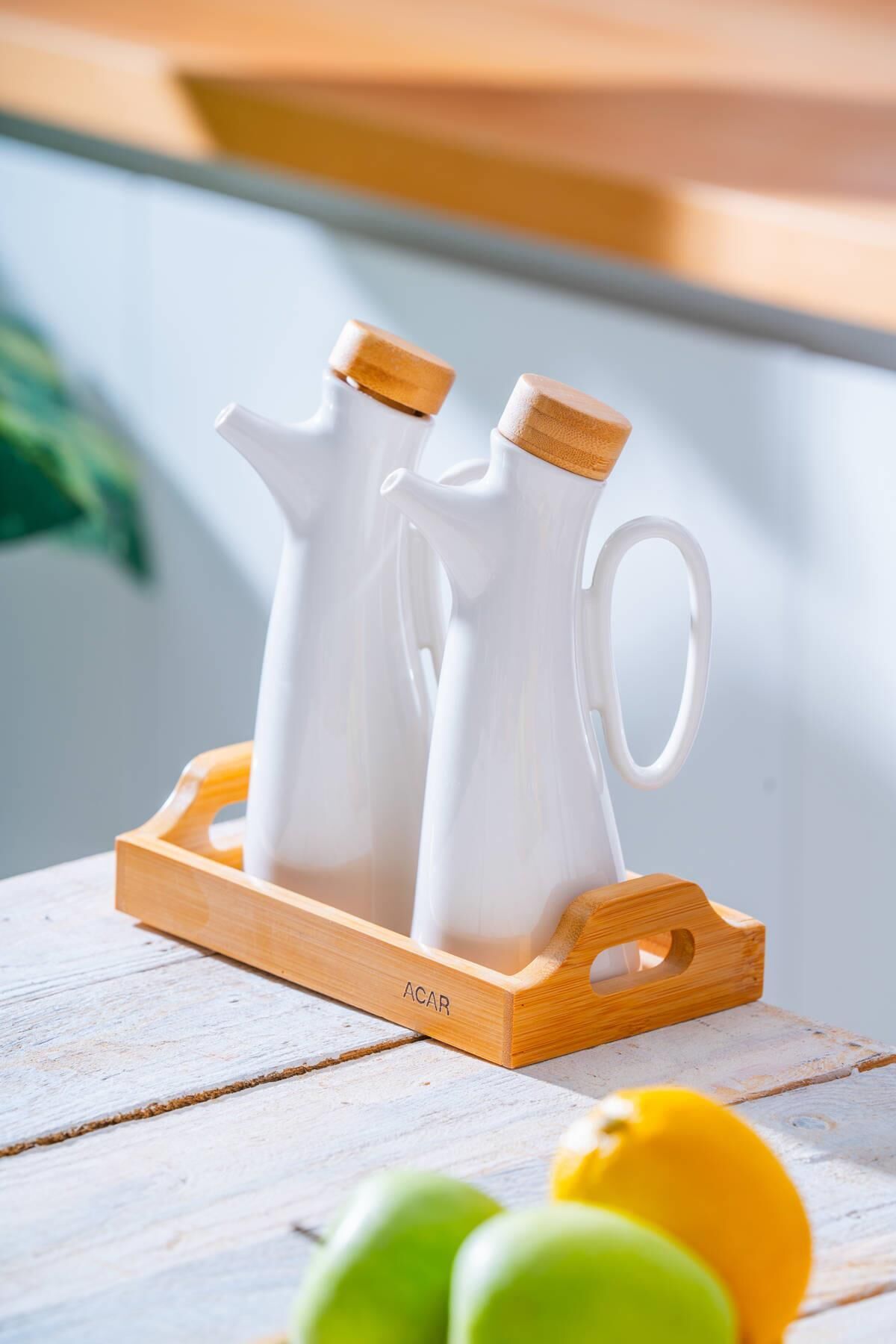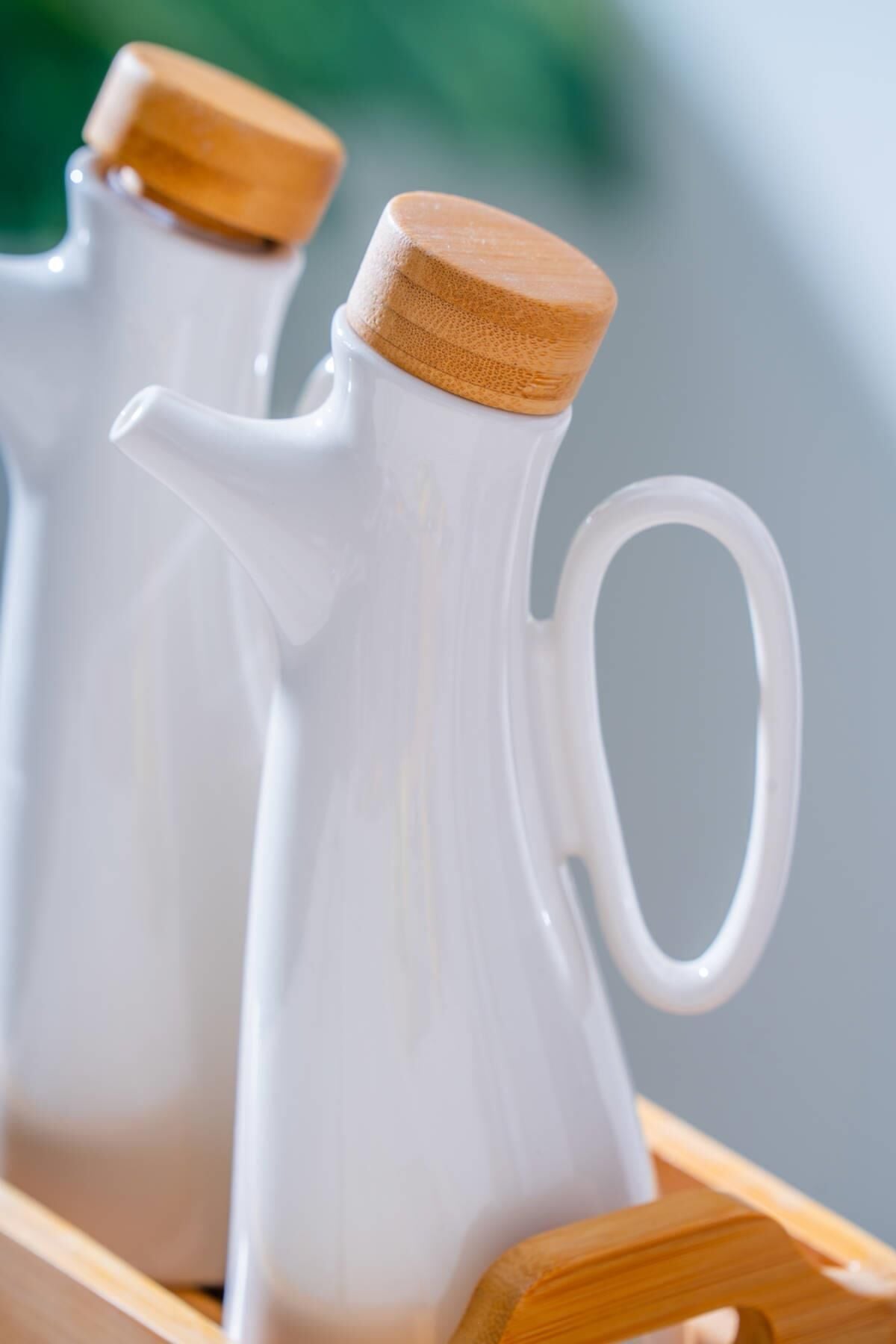 The Pamira Bamboo Stand Oil & Vinegar Bottle Set combines natural beauty and elegance in the kitchen. Its porcelain bottles and bamboo stand offer both aesthetic and practical use.