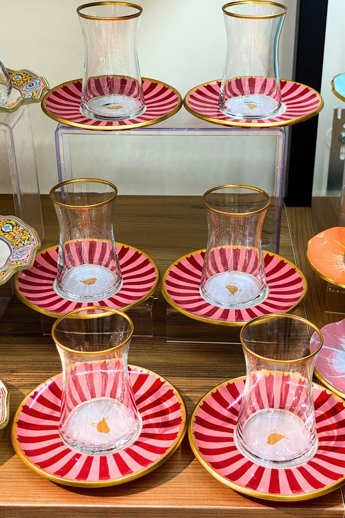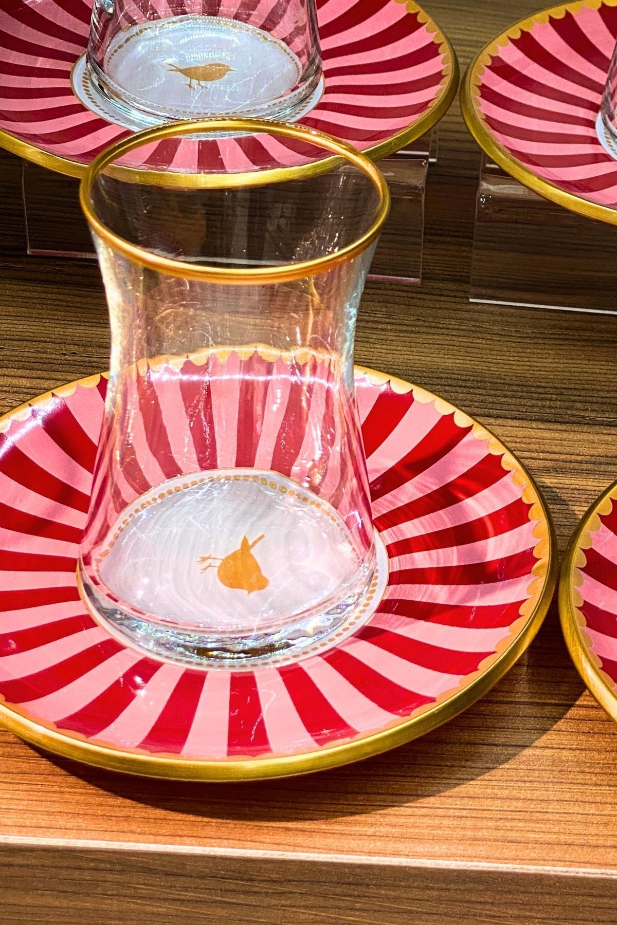 Altın yaldız detaylı özel tasarım çay bardakları ve uyumlu çay tabakları ile sofralarınıza şıklık katar. Günlük kullanımda ve misafir sunumlarında zarif bir görünüm sağlar.