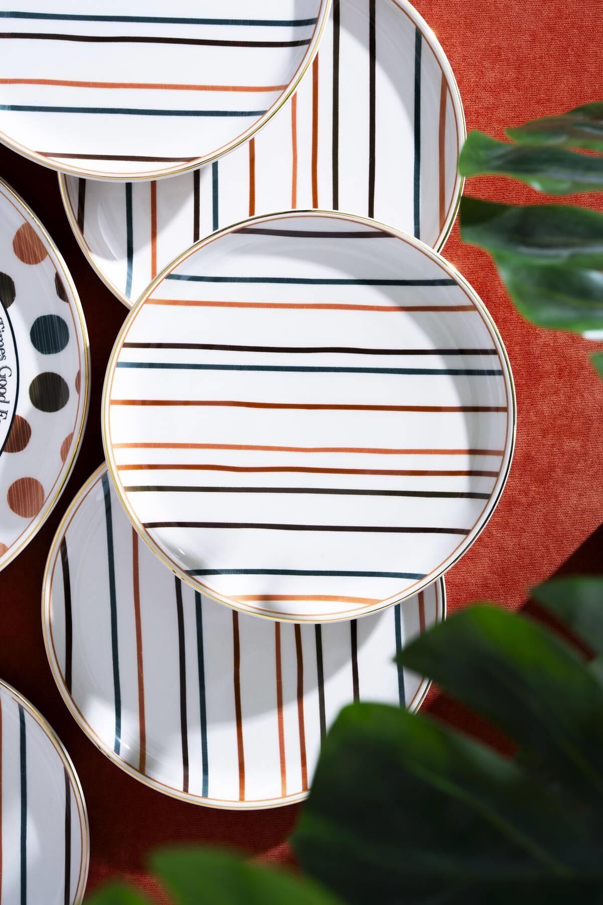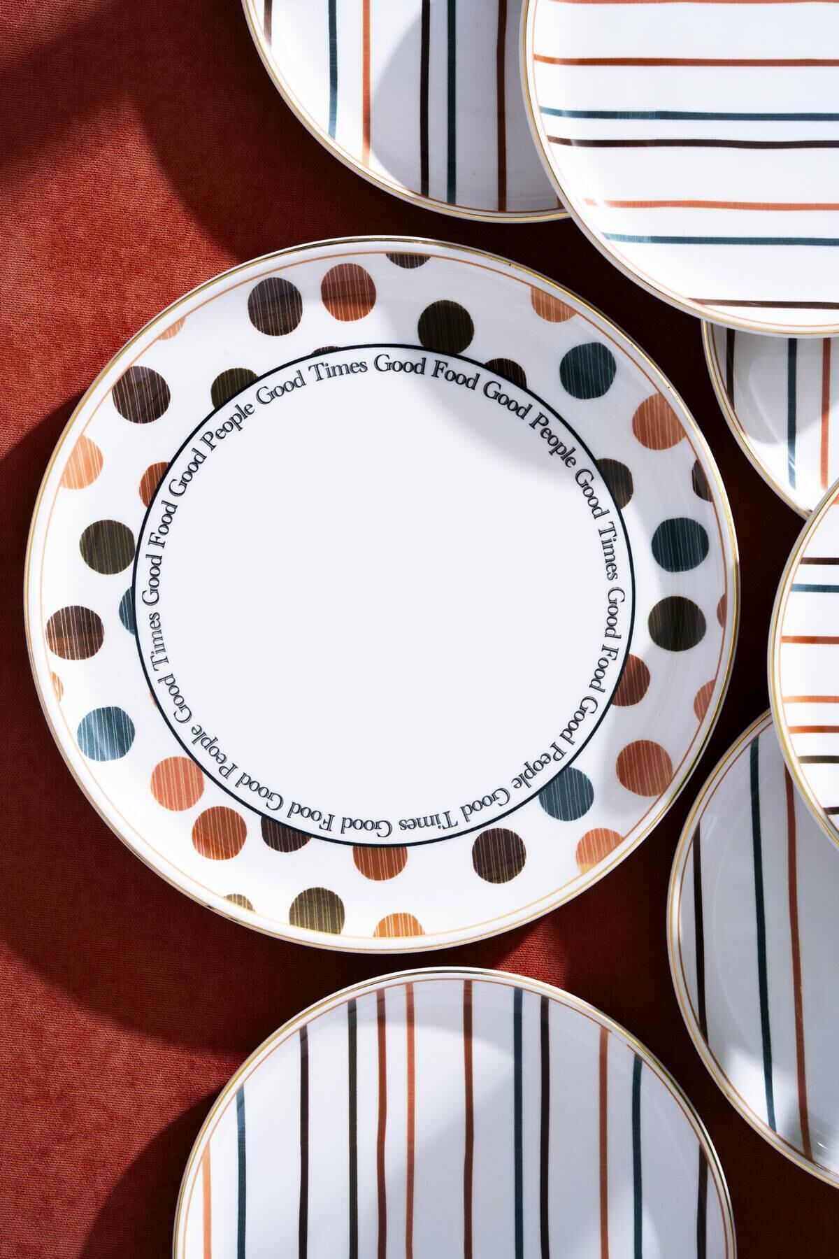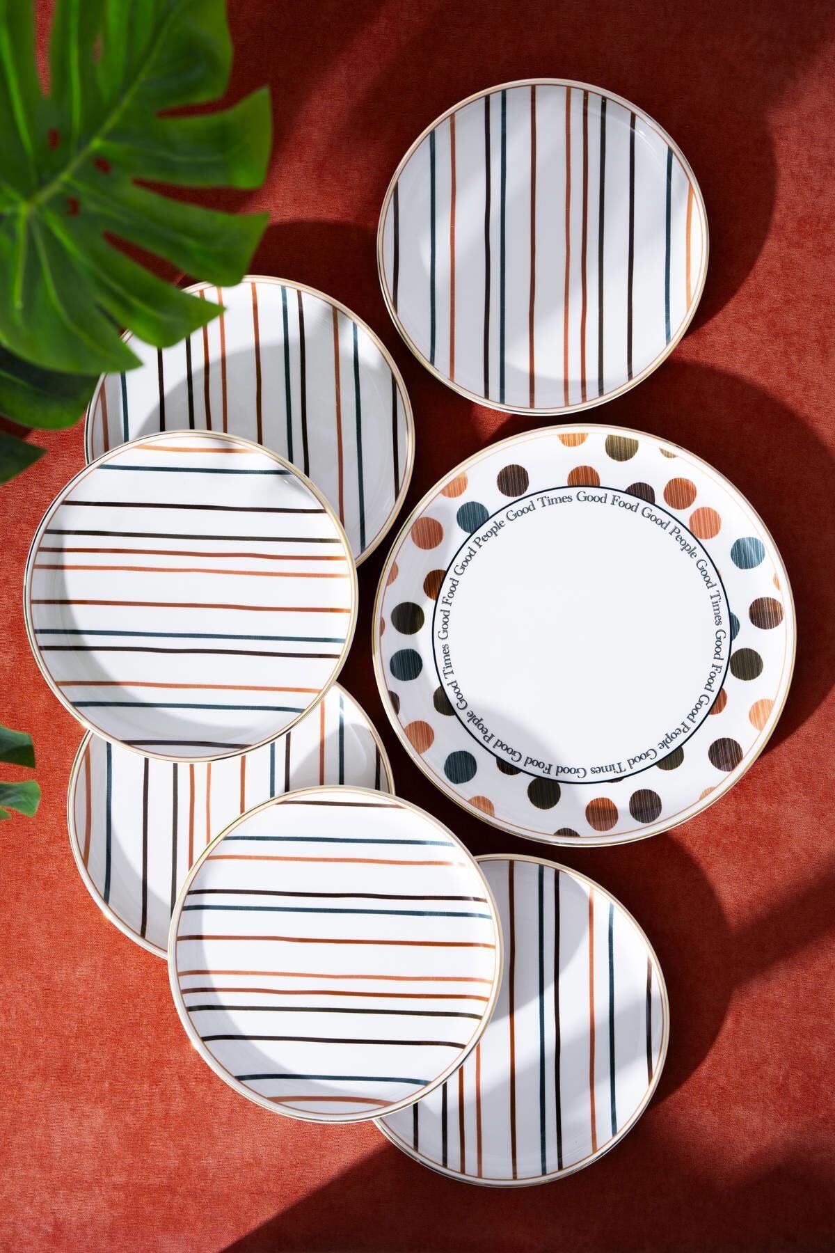 The Tessa 7-Piece Cake Set boasts an energetic design where modern lines meet warm tones. Each plate conveys the joy of weekend breakfasts and sweet moments shared with friends. Gold details add elegance, while vibrant color transitions bring your table to life.