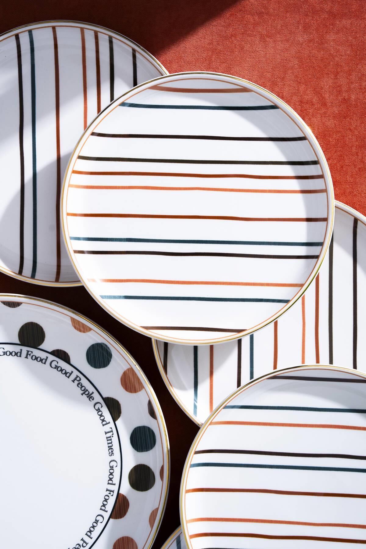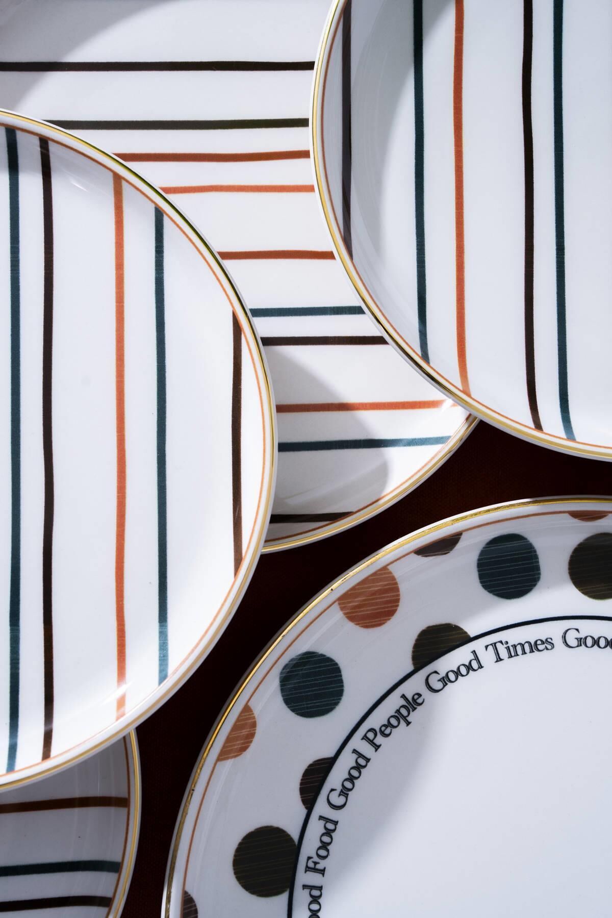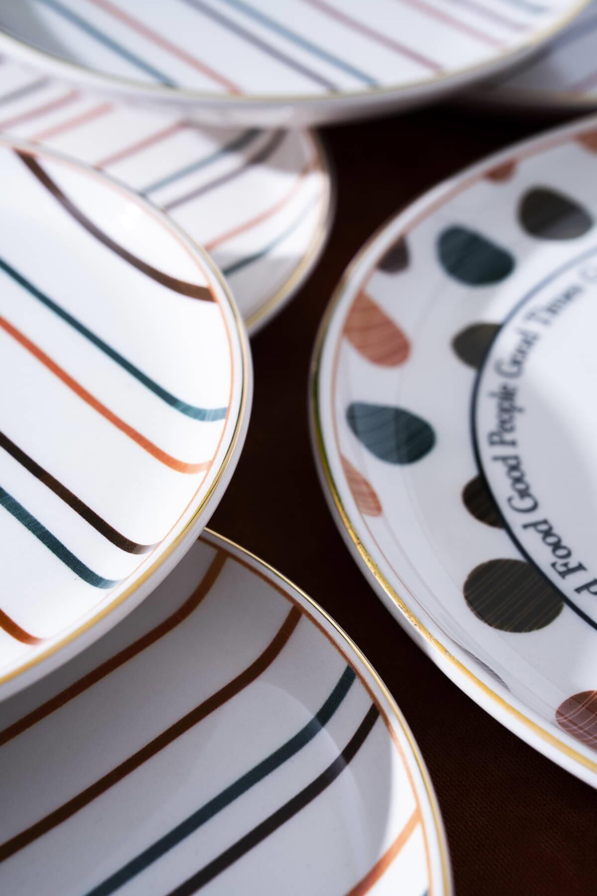 The Tessa 7-Piece Cake Set boasts an energetic design where modern lines meet warm tones. Each plate conveys the joy of weekend breakfasts and sweet moments shared with friends. Gold details add elegance, while vibrant color transitions bring your table to life.