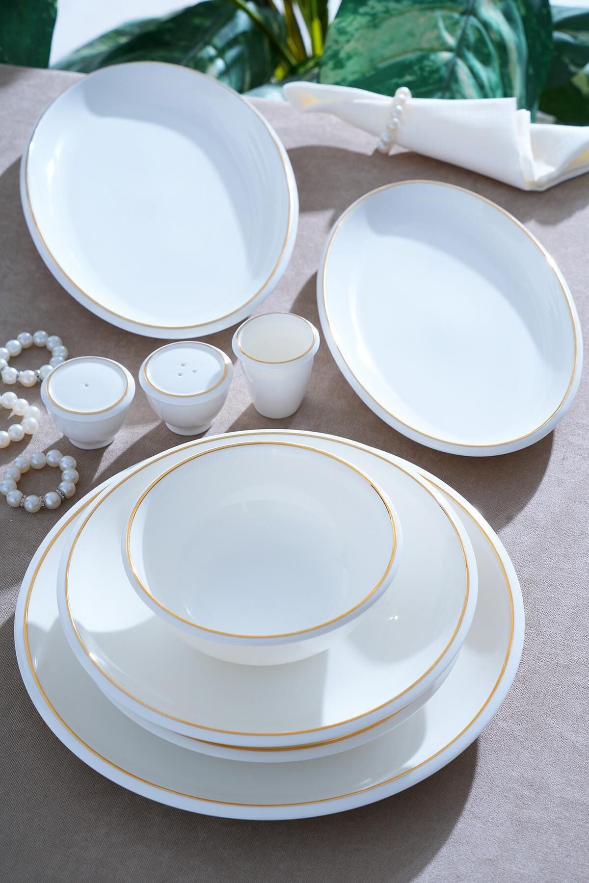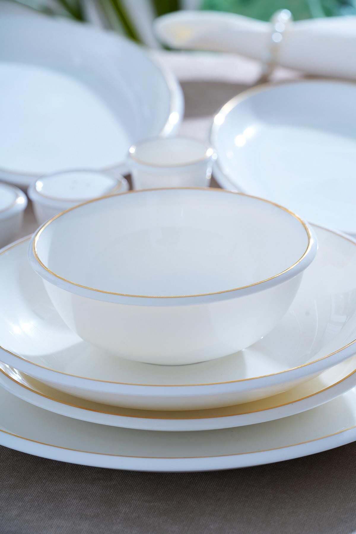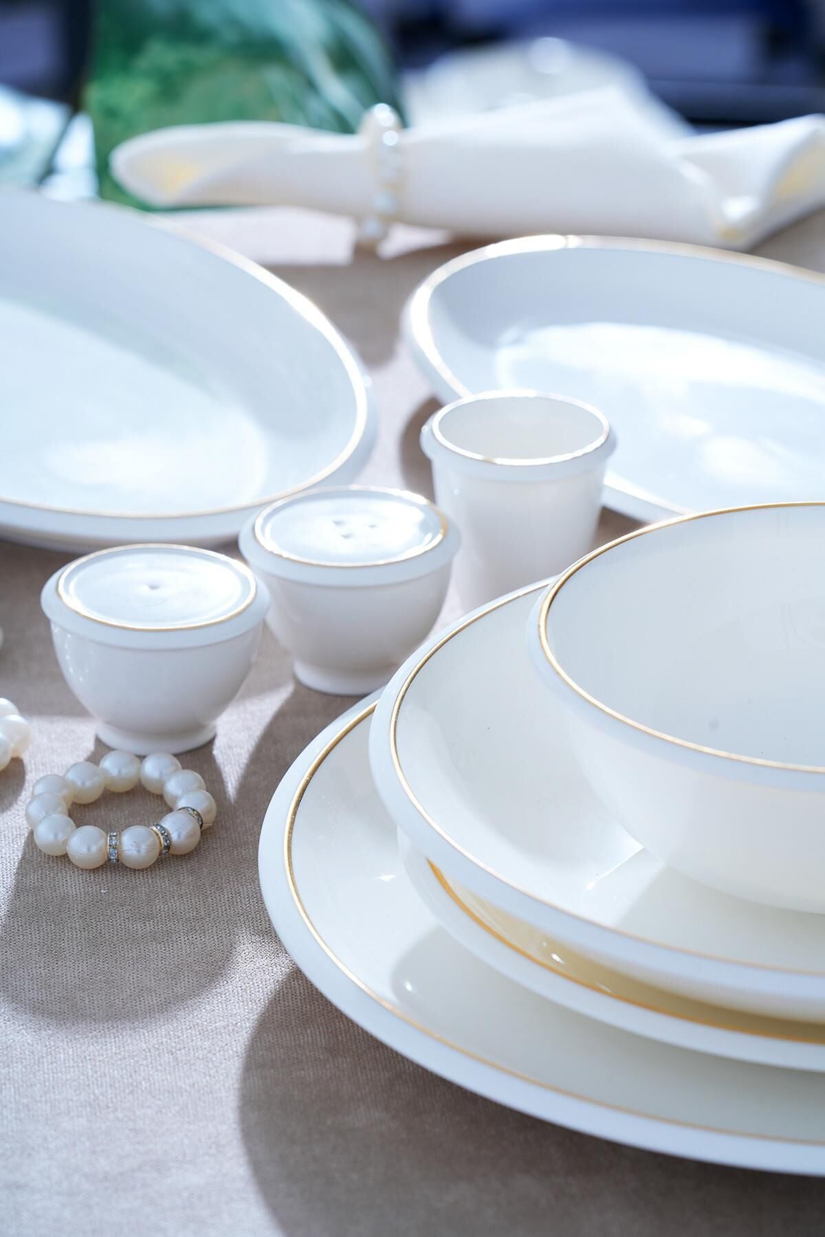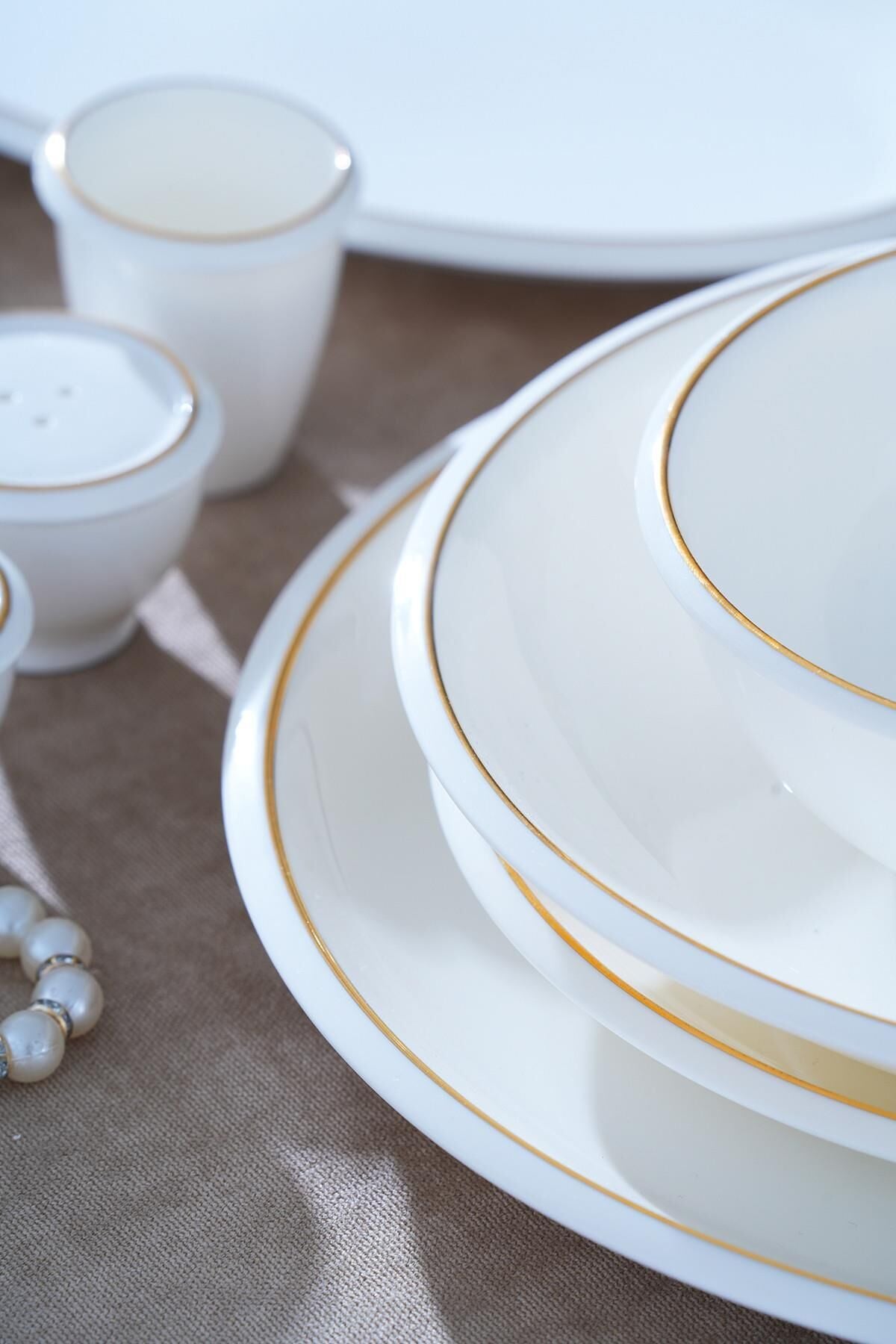 The Wilhide Dinner Set , with its modern and elegant design, creates a simple sparkle on the table. Its generous 12-person capacity adds elegance to any table, from everyday use to special occasions. The natural white texture of the porcelain combines with gold details to create a sophisticated look.