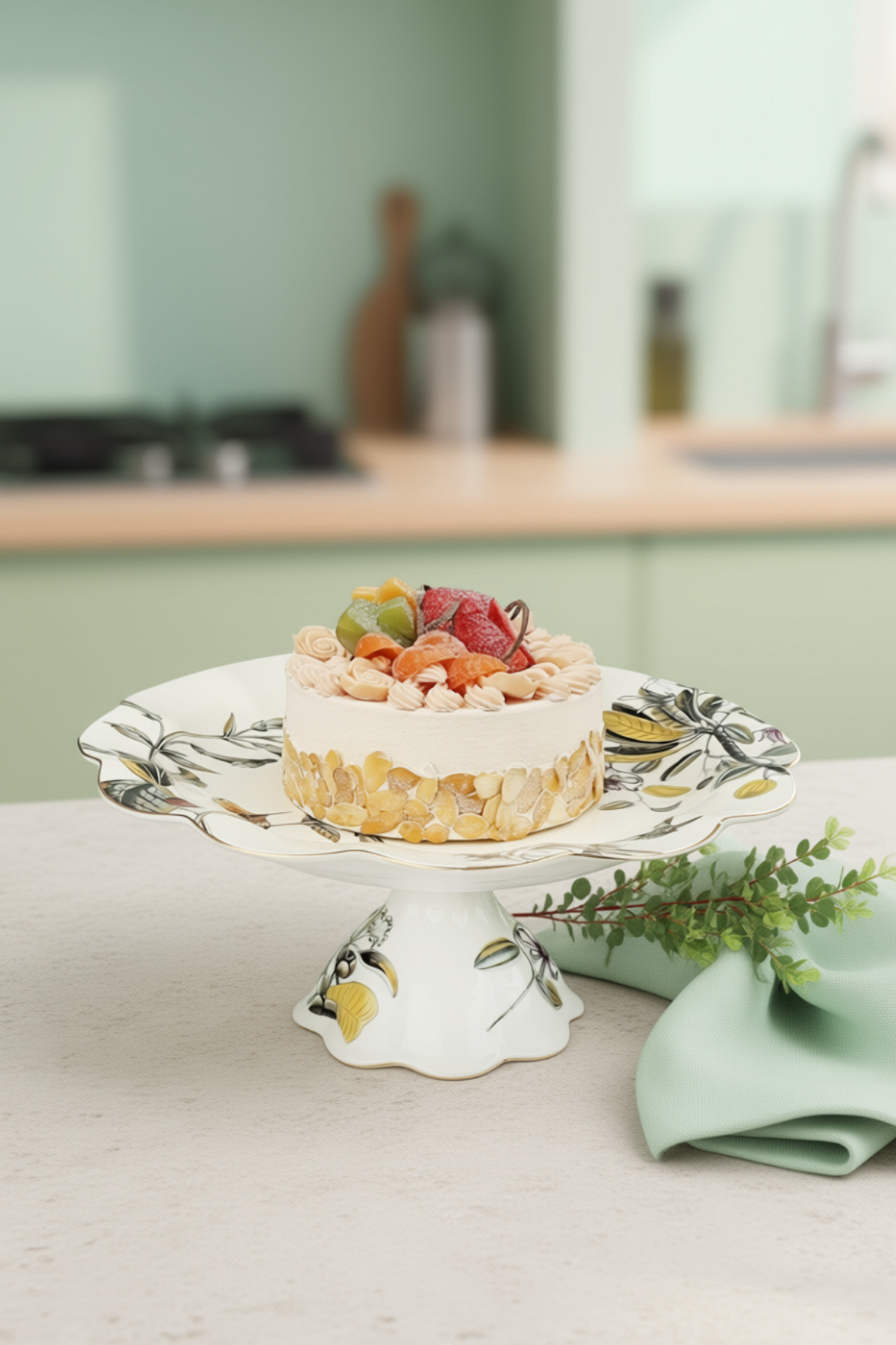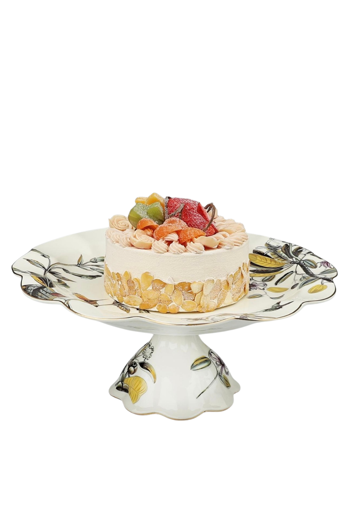 Flora Kuş Desenli Porselen Pasta Standı, geniş yüzeyi ve estetik ayak yapısı ile pastalarınızı, keklerinizi ve tatlılarınızı göz alıcı şekilde sunmanızı sağlar.