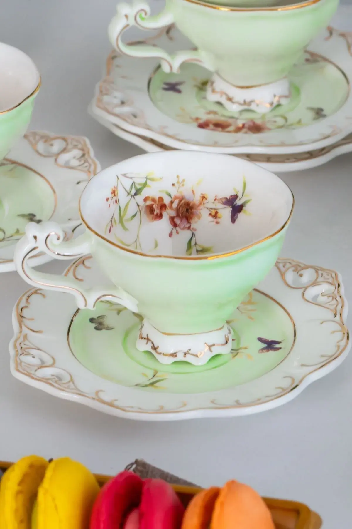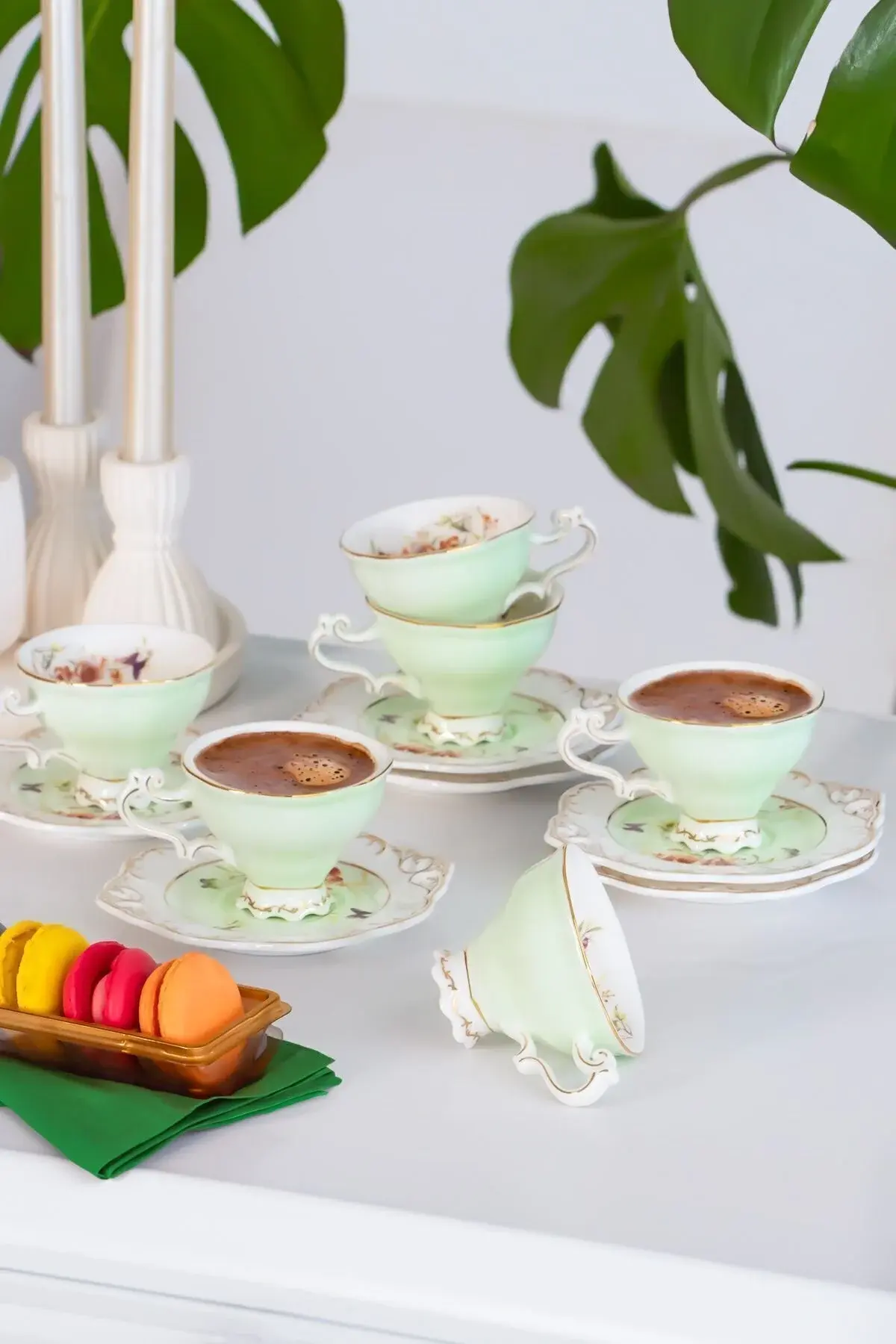 Doğadan ilham alan zarif çiçek desenleri, Yeşil tonları ve ışıltılı detaylarıyla kahve keyfinizi şıklıkla buluşturur. Ayaklı formu sayesinde nostaljik ve zarif bir duruş sunar.