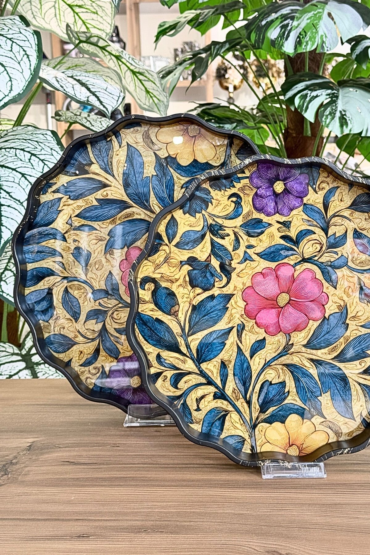 Canlı çiçek desenleriyle tasarlanan 2’li Ahşap Gövdeli Cam Tepsi Seti, sofralara hem sıcaklık hem zarafet kazandırır. Üst kısmındaki parlak cam yüzey kolay temizlik sağlarken, ahşap çerçevesi dayanıklılığı artırır. Arka kısmı kadife kaplama olup yüzeyleri çizmeyi önler.