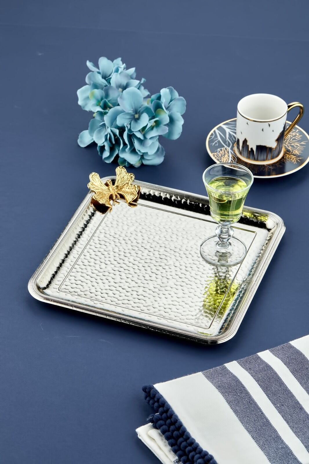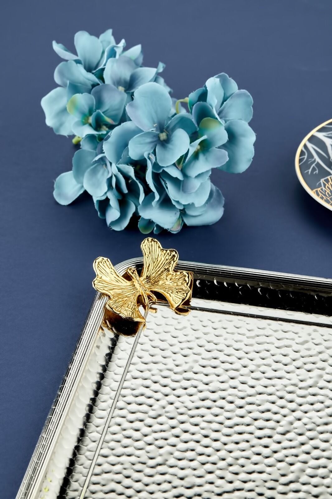 Silver kelebek desenli sunum tepsisi, her sunumda sade ışıltısıyla dikkat çeker. Tekli kullanımda dahi sofralara zarif ve çağdaş bir görünüm kazandırır.