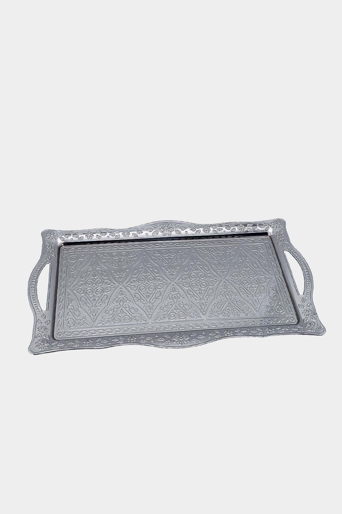 Küçük Boy Silver Dikdörtgen Sunum Tepsi, sade zarafetiyle sofralarınıza lüks bir dokunuş getirir. Gümüş yansımasıyla her ortamda dikkat çeker, hem işlevsel hem estetik bir sunum deneyimi yaşatır.