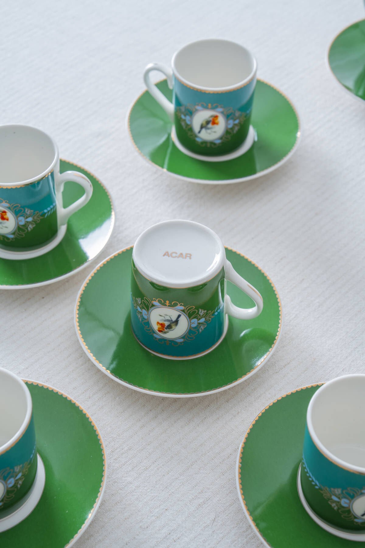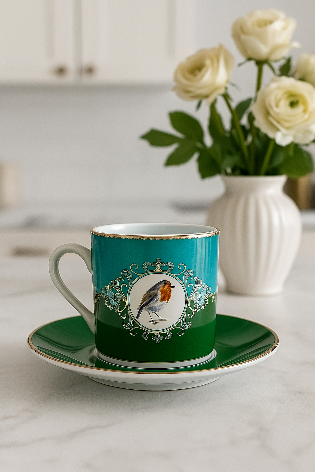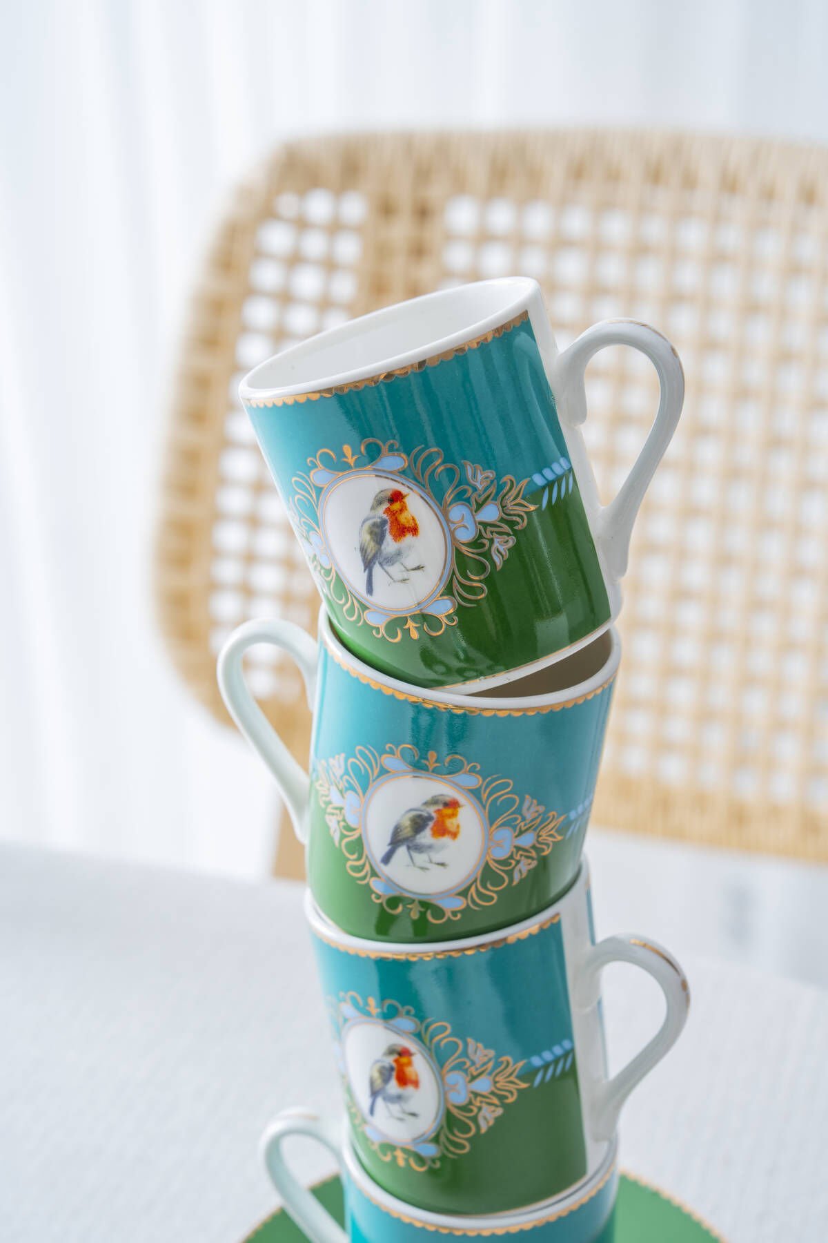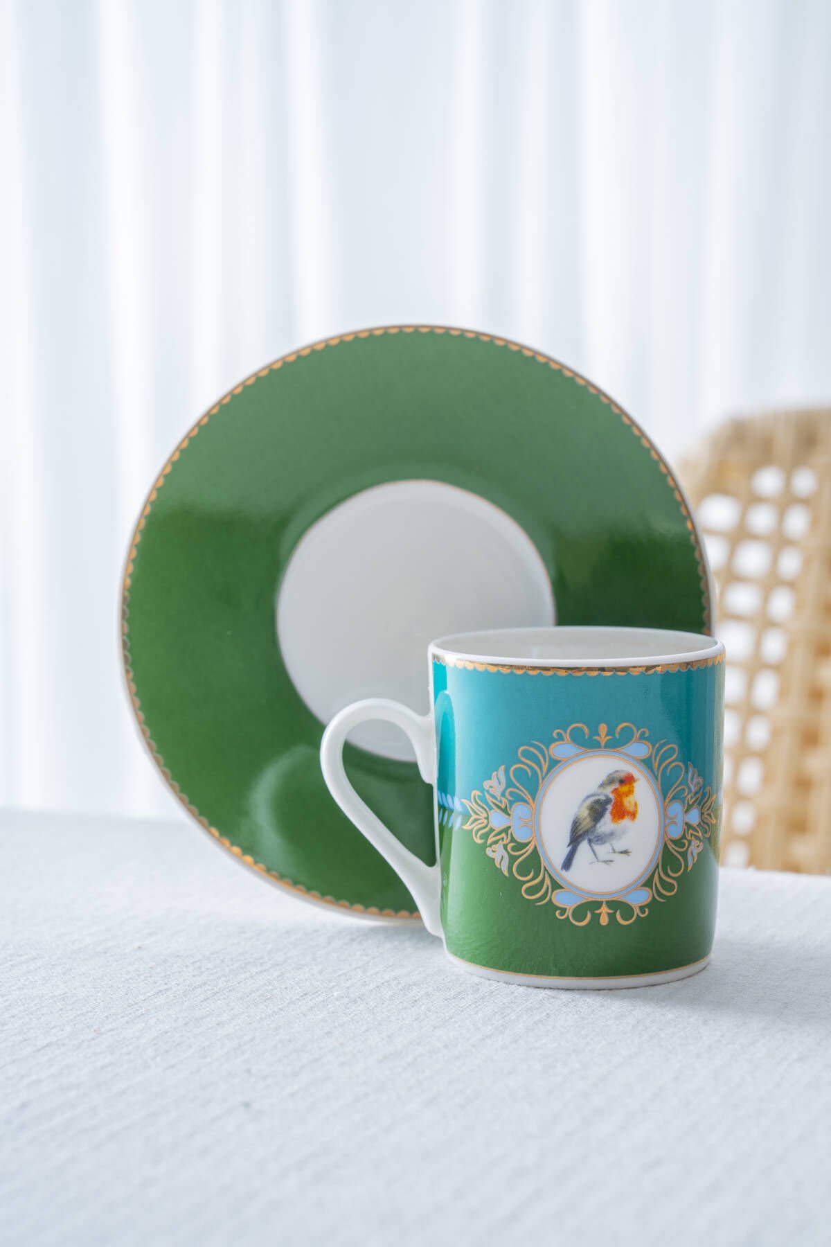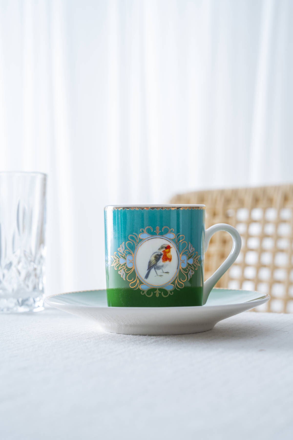 Kuş Figürlü Yeşil - Mavi 6’lı Kahve Fincan Takımı, modern formu ve canlı renk geçişiyle kahve sunumlarınıza dikkat çekici bir şıklık katar. Mavi üst ton ile yeşil alt gövdenin uyumu, merkezdeki kuş illüstrasyonuyla birleşerek koleksiyonluk bir tasarım ortaya çıkarır.