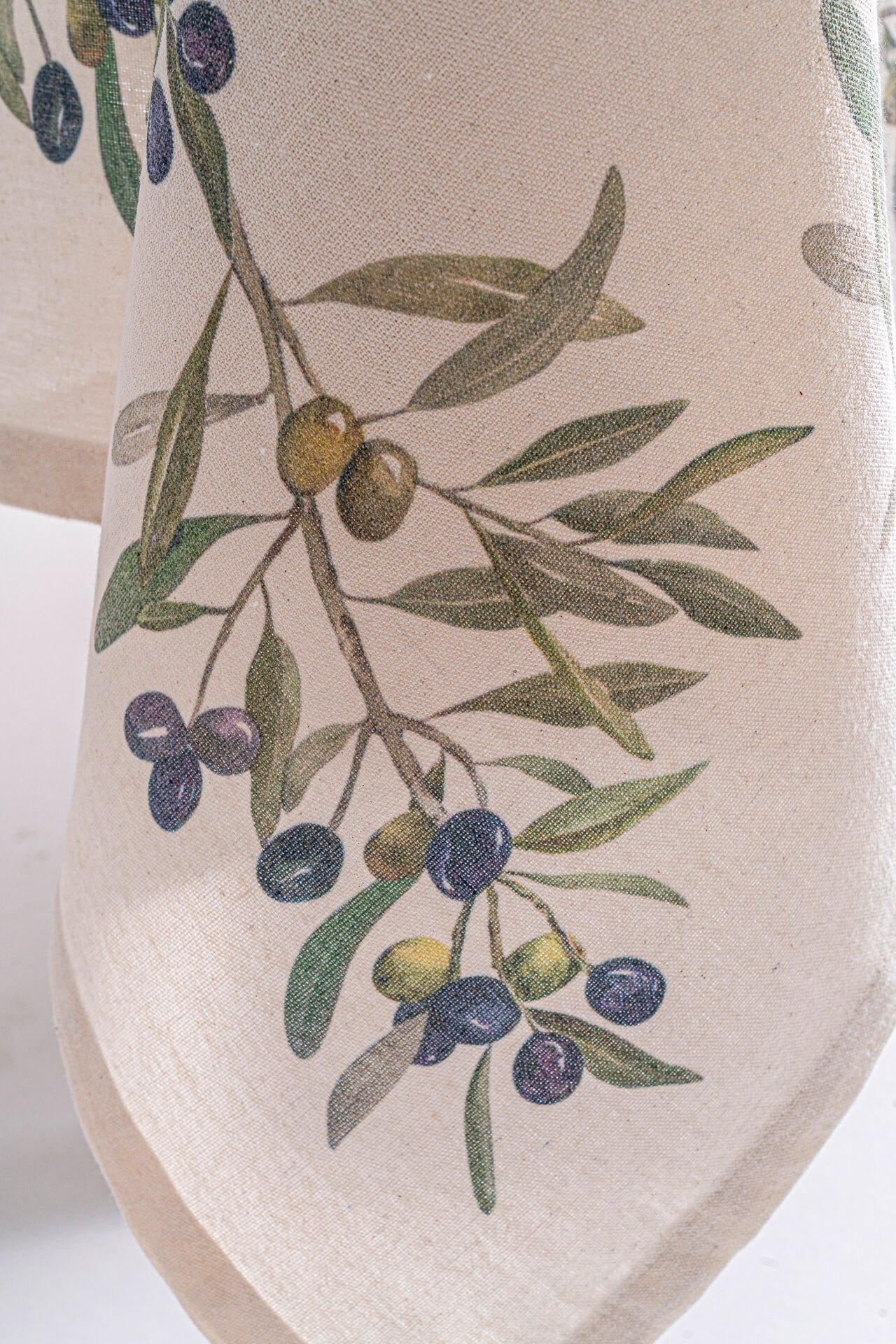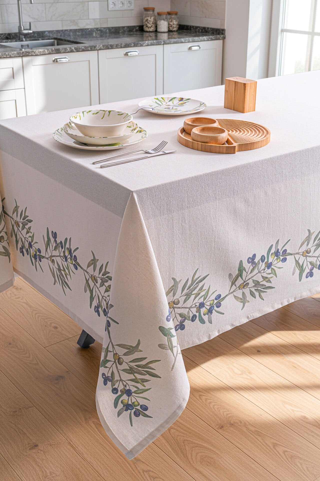 Olive Zeytin Desenli Yumuşak Dokulu Keten Masa Örtüsü, doğanın huzurunu sofralarınıza taşır. Akdeniz’in zarif zeytin dallarından ilham alan bu tasarım, sade ama dikkat çekici detaylarıyla sofralara ferahlık ve estetik bir denge kazandırır.