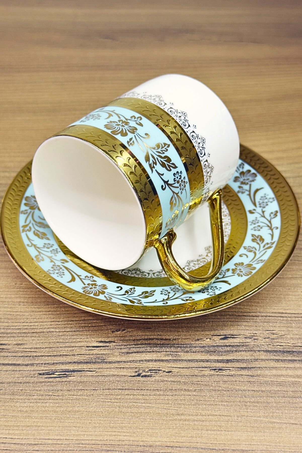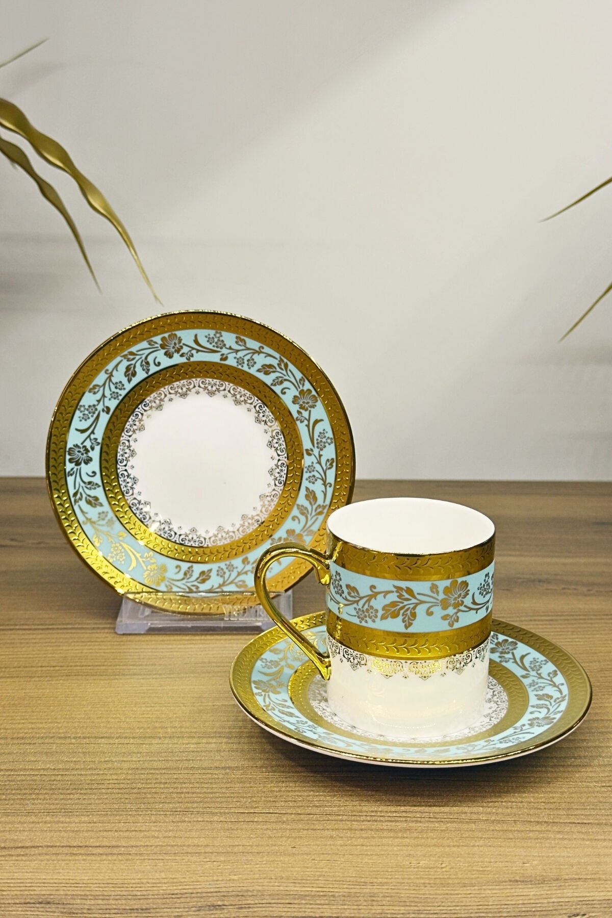 Olivette Kahve Fincanı Takımı, modern tasarımı ve lüks işlemeleriyle hem misafir sofralarına hem de hediye alternatiflerine zarif bir dokunuş getirir. Aqua tonlarının huzuru ve altın detayların ihtişamı, kahve keyfinizi bir ritüele dönüştürür.