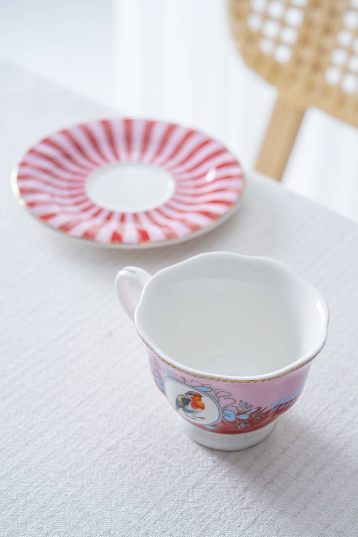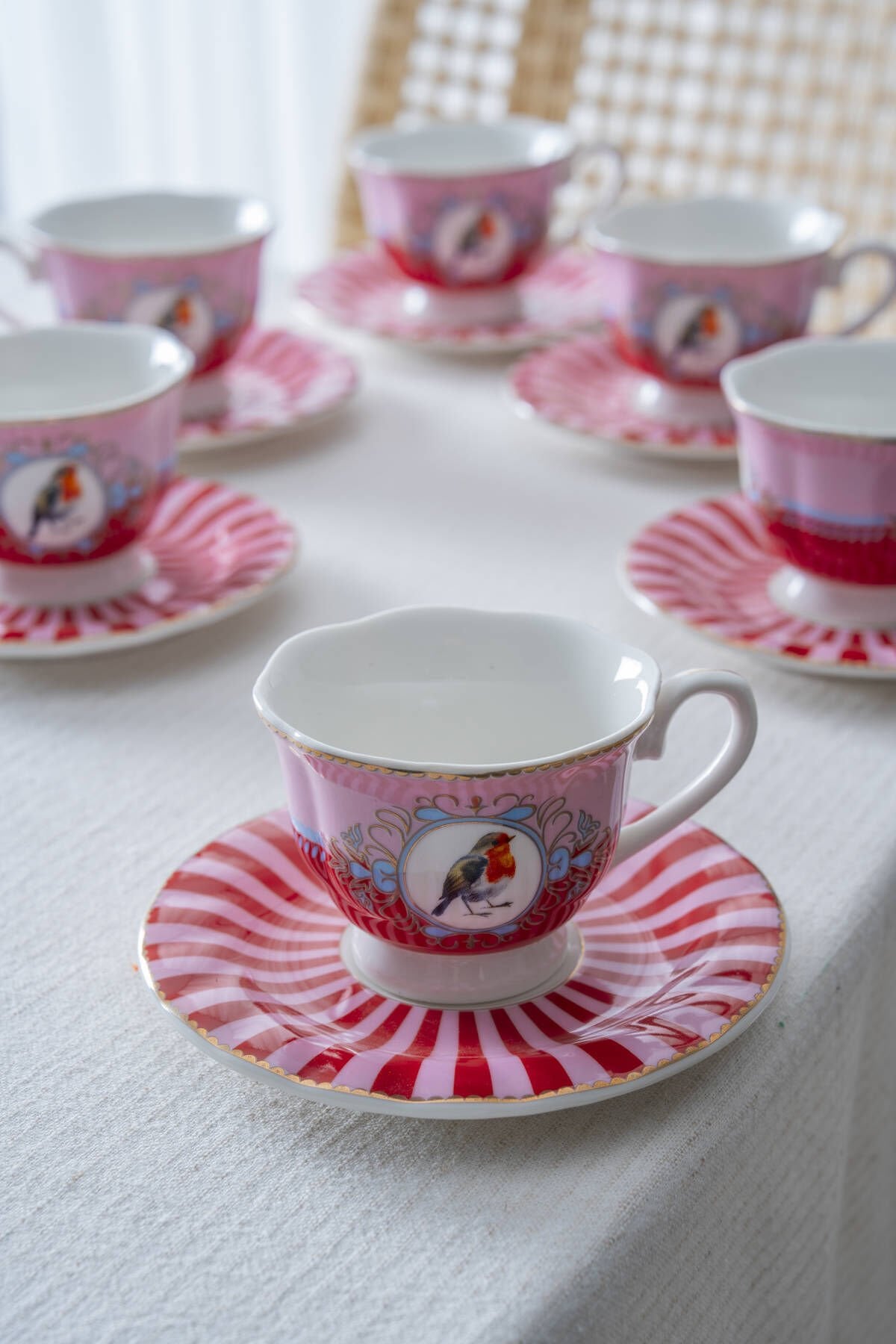Magic Kuş Figürlü Kırmızı Çizgili 6’lı Kahve Fincan Takımı, canlı renkleri ve romantik kuş illüstrasyonlarıyla kahve sunumlarınıza neşeli bir şıklık katar. Pembe tonlardaki fincan gövdesi, kırmızı-beyaz çizgili zarif tabaklarla buluşarak hem günlük kullanımlarda hem de misafir ağırladığınız özel anlarda sofranızın odak noktası olur.