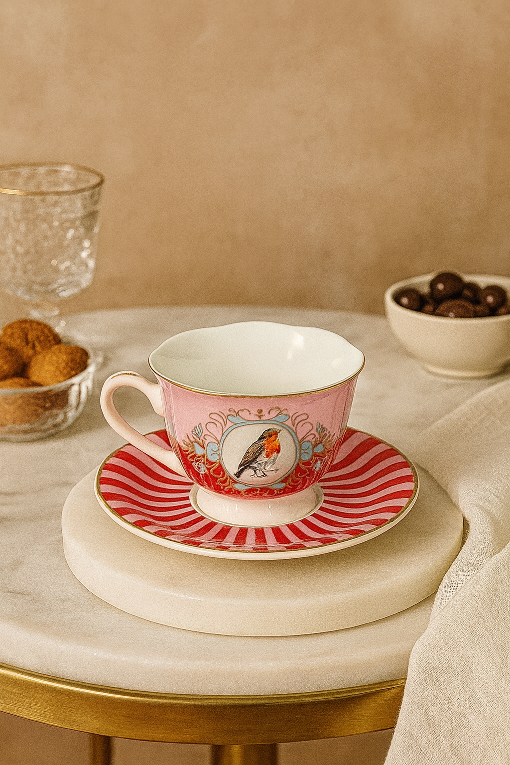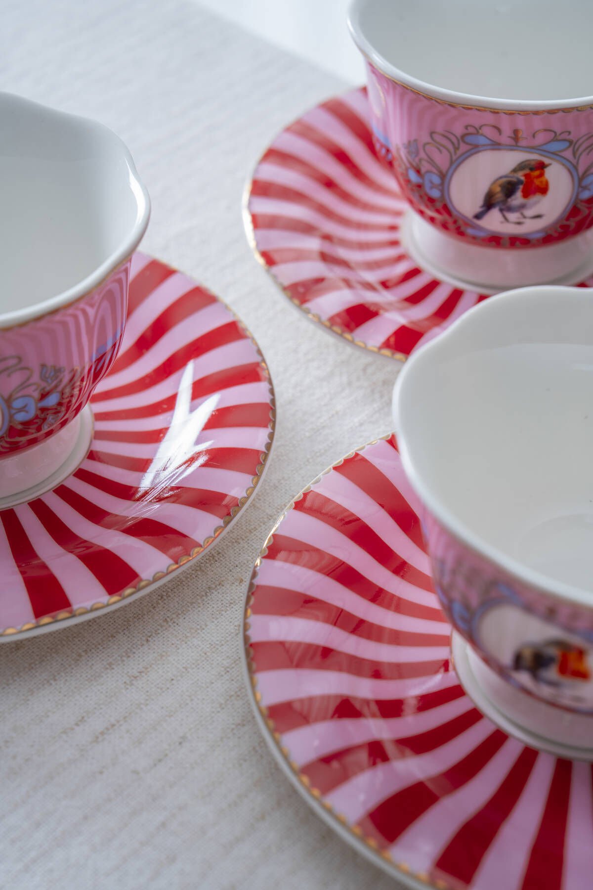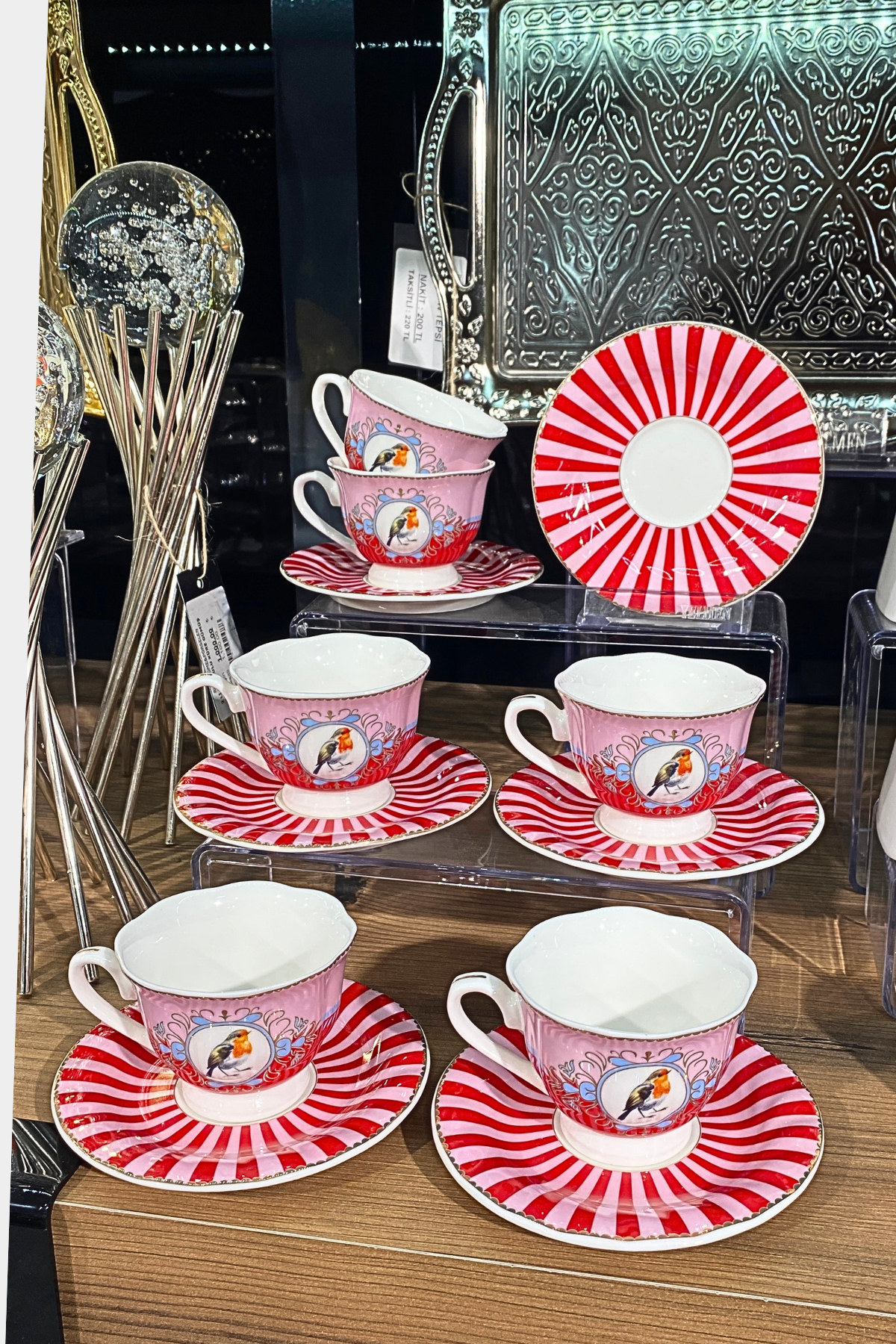 - Kırmızı-beyaz çizgili fincan tabakları, sofraya enerjik ve modern bir görünüm kazandırır.
