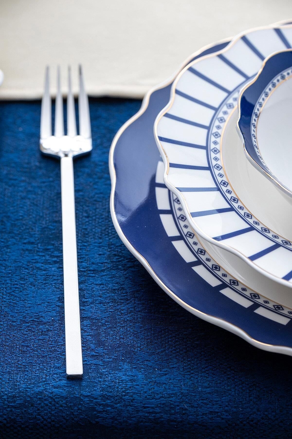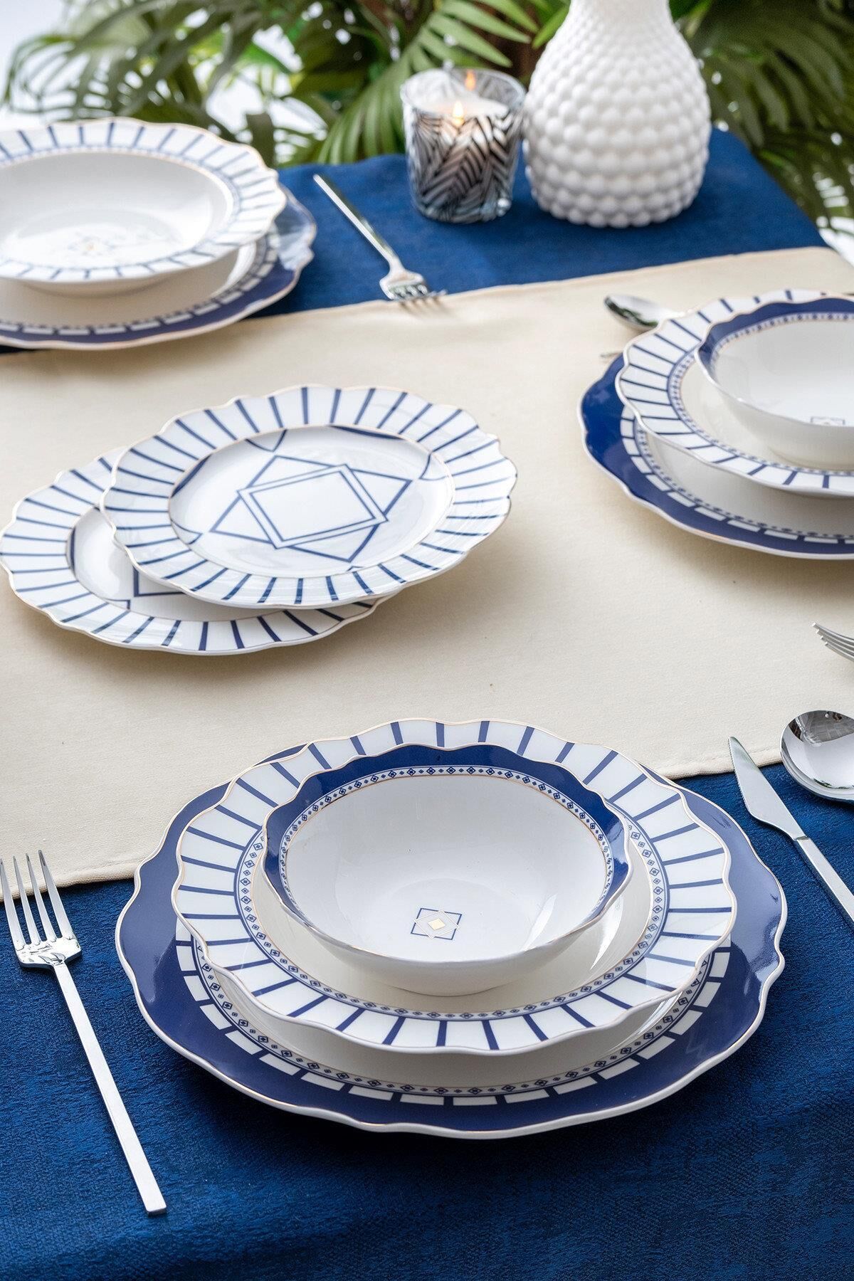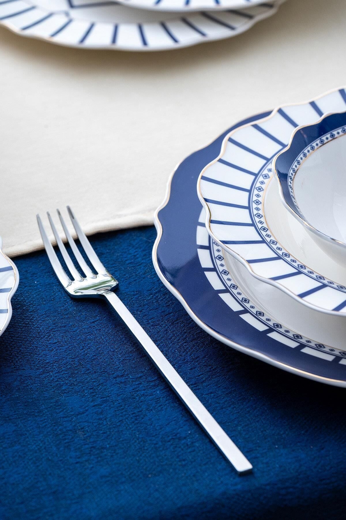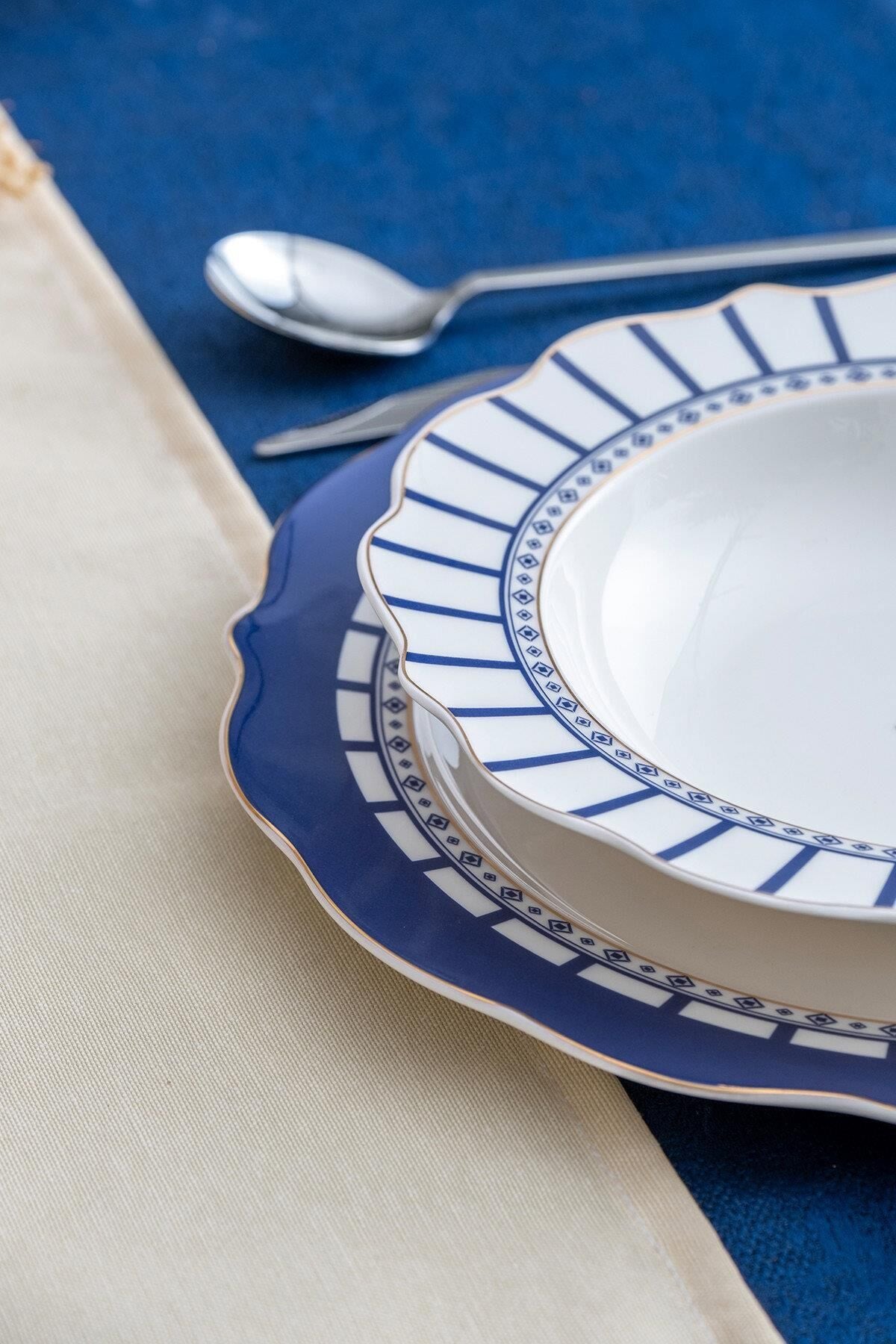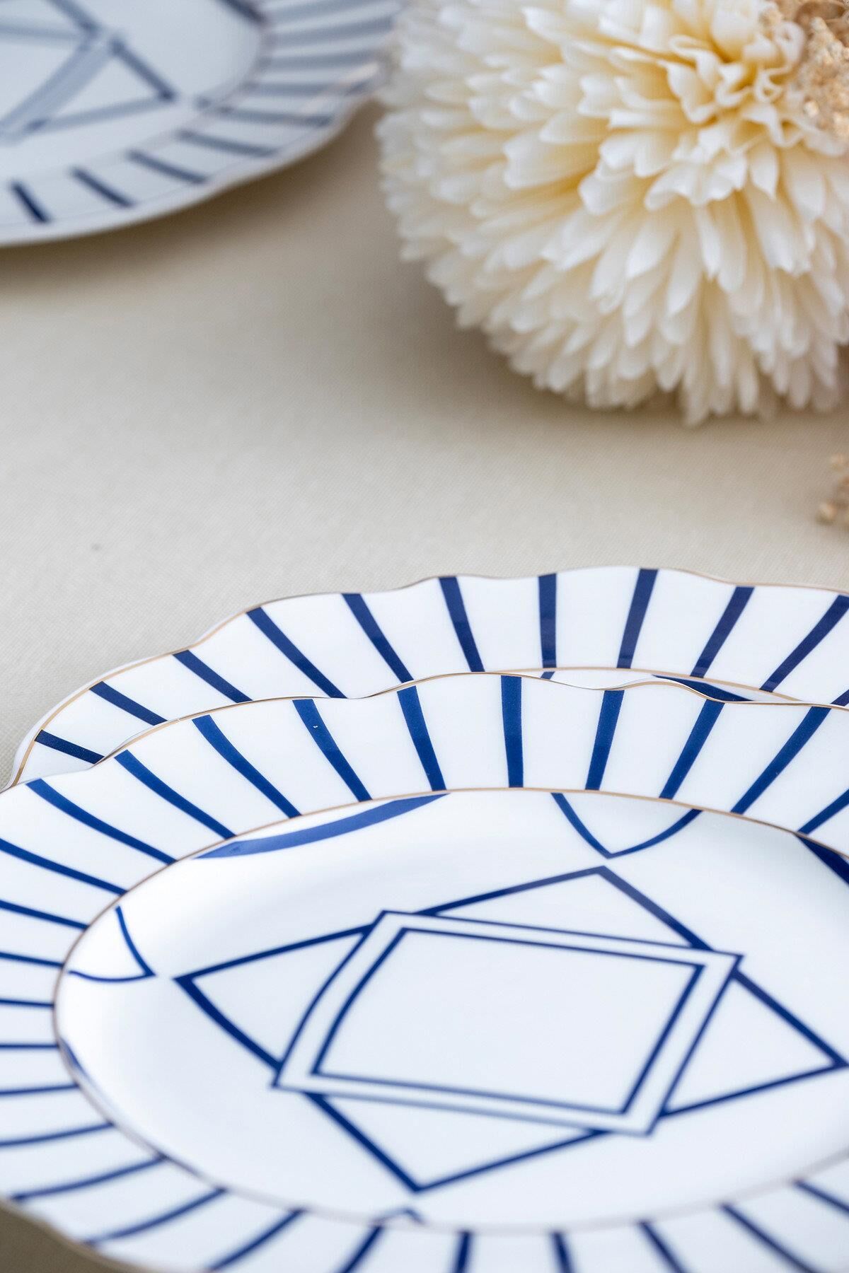 Lacivertin asaleti ve beyazın saflığı, bu zarif yemek takımında kusursuz bir uyum içinde buluşuyor. Renna 6 Kişilik 24 Parça Porselen Yemek Takımı, Akdeniz esintilerini sofralarınıza taşıyarak her öğünü özel bir davete dönüştürür. Dalga formundaki zarif tabak kenarları, altın detaylarla çerçevelenmiş mavi geometrik desenleriyle birleştiğinde; klasik, zamansız ve aynı zamanda çağdaş bir görünüm ortaya çıkar.