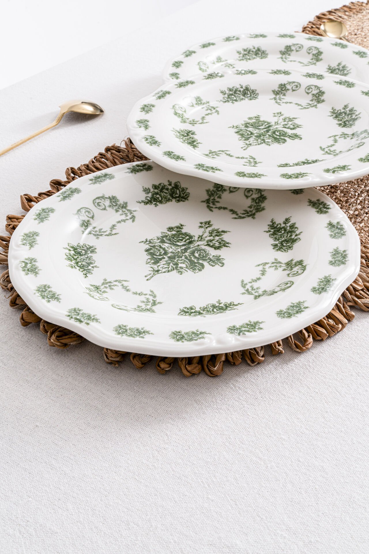 Vintage dokunuşlu bu porselen tabaklar, Vintage Flowers Green koleksiyonunun tamamlayıcı parçasıdır. Aynı desene sahip yemek tabağı, pasta tabağı ve çorba kasesi ile birlikte masa örtüsü ve runner gibi tekstil ürünleriyle kombinleyerek sofralarınızda uyumlu ve estetik bir bütünlük oluşturabilirsiniz.