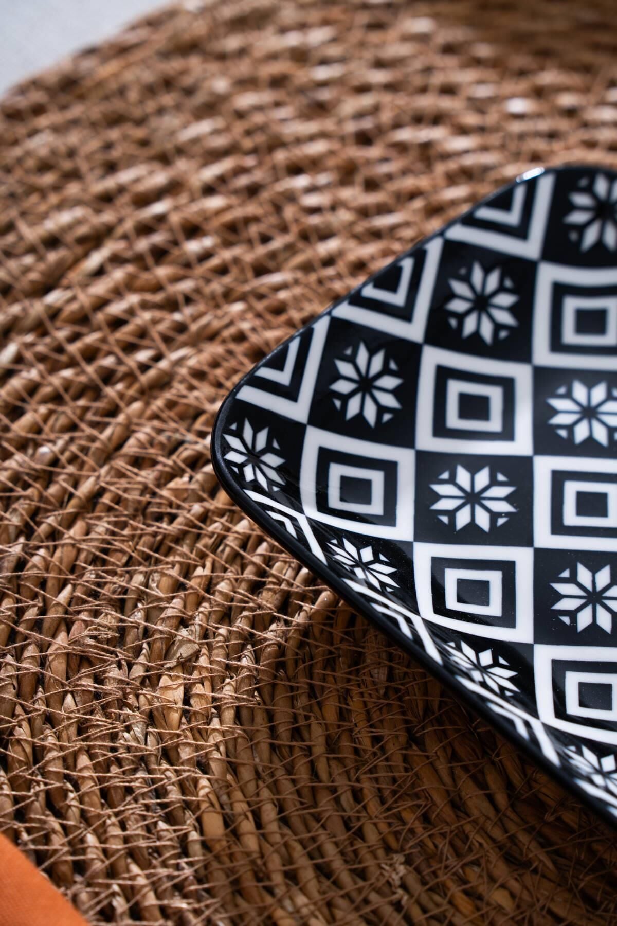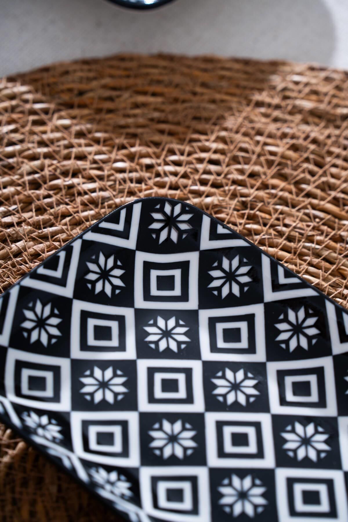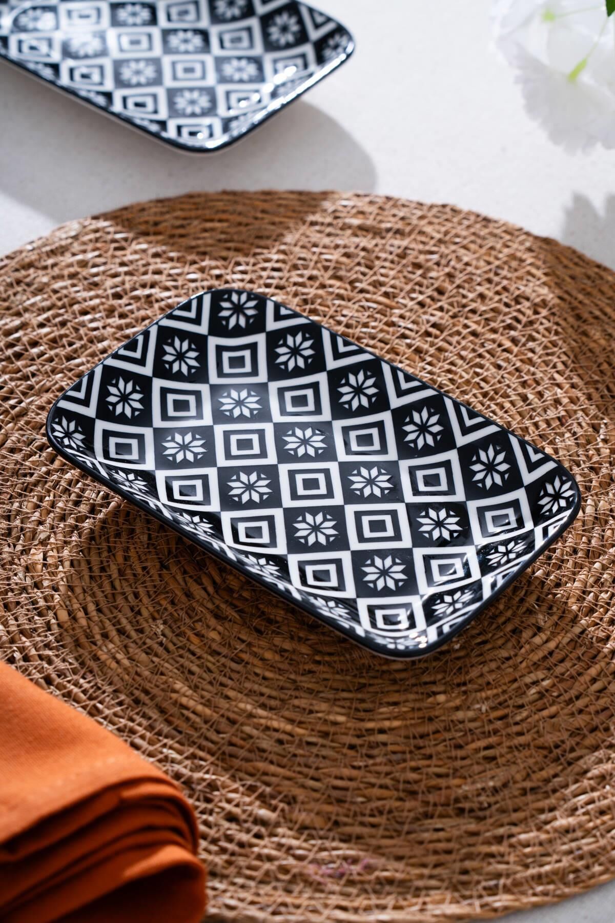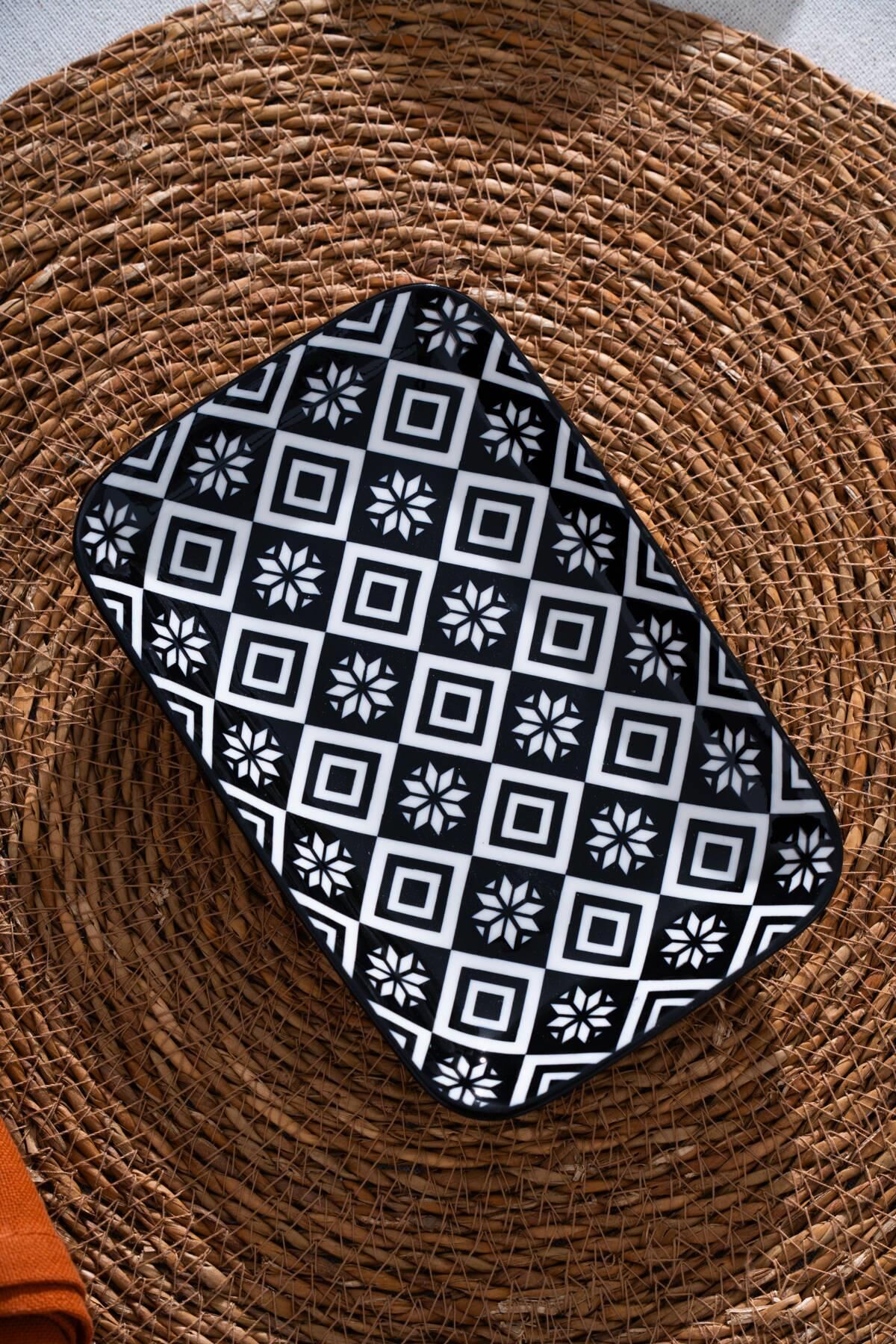 Willa Dikdörtgen Sunum Tabak, siyah-beyaz etnik desenleriyle sofralarınıza modern ve karakterli bir hava kazandırır. Zarif geometrik motifleriyle dikkat çeken bu özel tasarım, geleneksel el işçiliği estetiğini çağdaş bir yorumla birleştirir. 17 cm uzunluğundaki formu sayesinde kahvaltı, meze veya tatlı sunumlarında ideal bir kullanım sağlar.